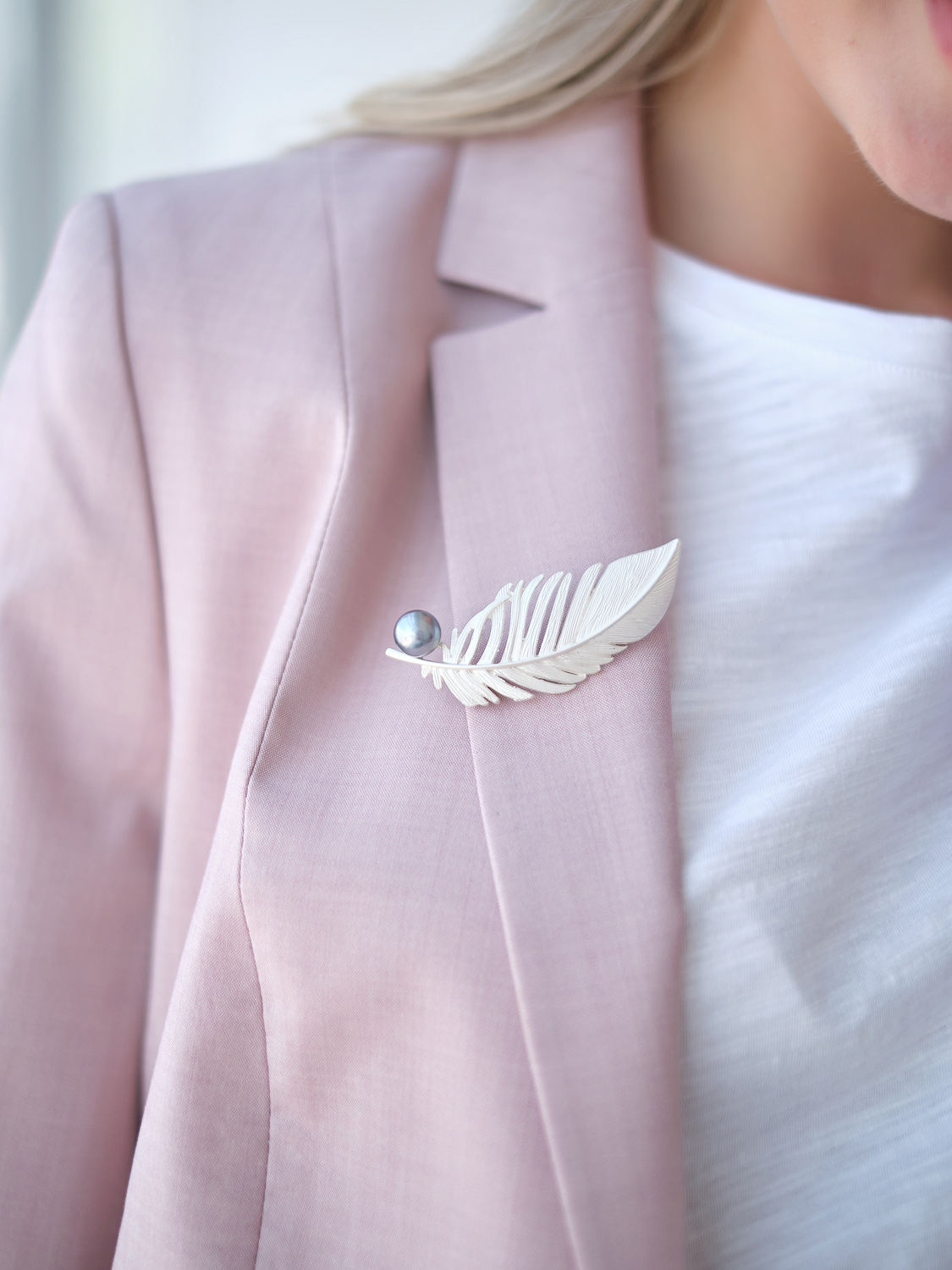 Изящная брошь в виде перышка с контрастным искусственным жемчугом. Добавит образу женственность и невесомость.