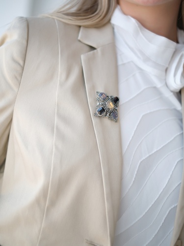 Роскошная брошь в форме ромба. Выполнена из комбинированных материалов с использованием горного хрусталя.