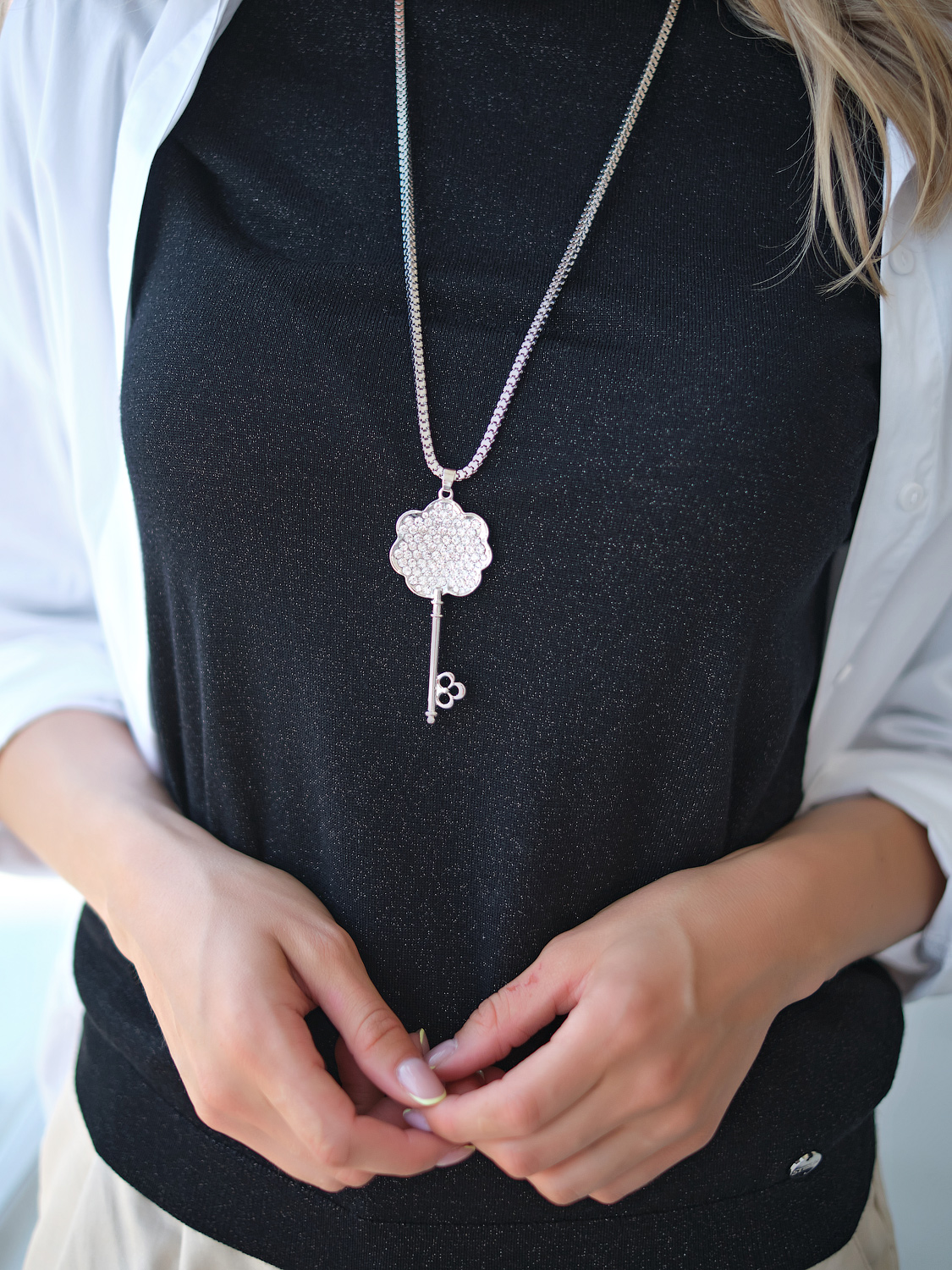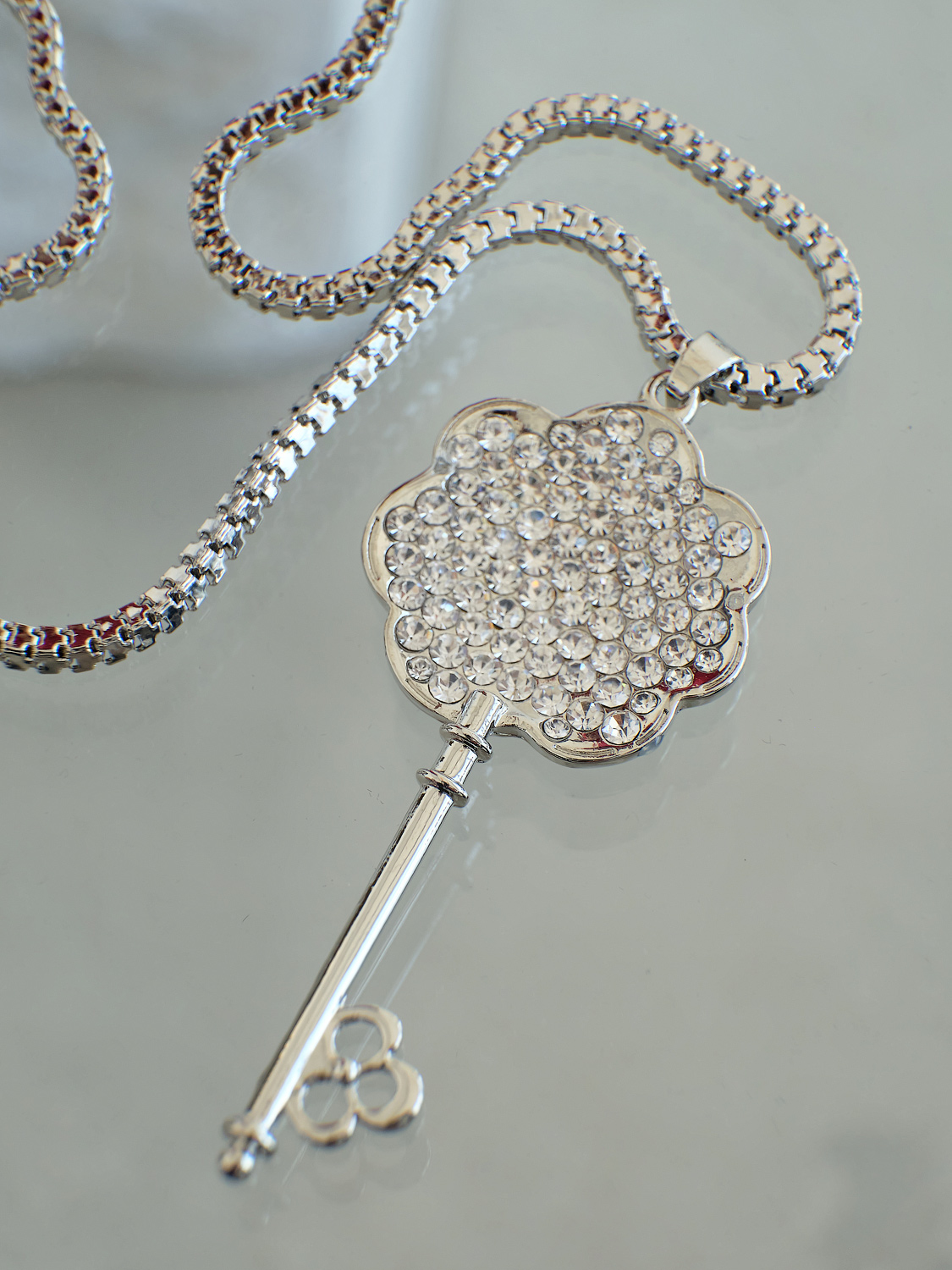 Стильная подвеска в виде ключа. Выполнена из комбинированных материалов, богато украшена стразами.