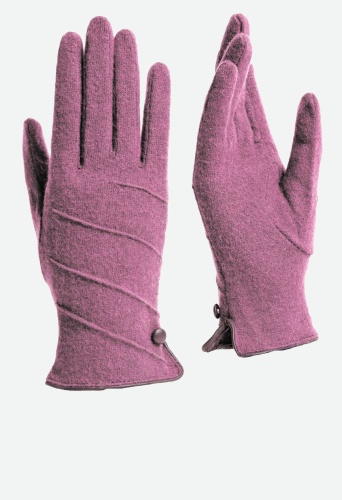Перчатки выполнены из трикотажной шерсти. Состав трикотажа: 80% шерсть, 20% нейлон. Без подкладки. Отделка - декоративные швы на лицевой стороне. Край манжеты и декоративная пуговица обтянуты заменителем кожи. Длина манжеты от нижней точки большого пальца до края перчатки - 6,5 см. Длина пальцев - средняя.