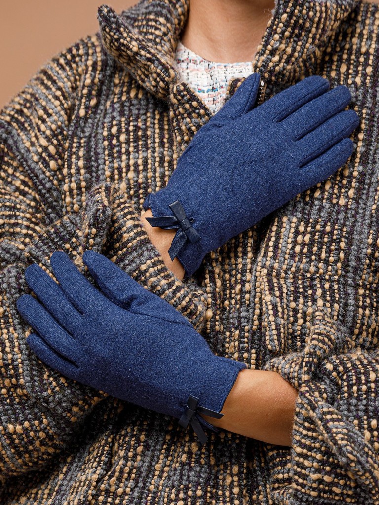 Перчатки выполнены из трикотажной шерсти. Состав трикотажа: 80% шерсть, 20% нейлон. Без подкладки. Отделка - декоративный бантик. Длина манжеты от нижней точки большого пальца до края перчатки - 6 см. Длина пальцев - средняя.