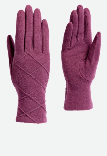 Перчатки выполнены из трикотажной шерсти. Состав трикотажа: 80% шерсть, 20% нейлон. Без подкладки. Отделка - декоративные строчки ромбами на лицевой стороне. Длина манжеты от нижней точки большого пальца до края перчатки 5 см. Длина пальцев - средняя.