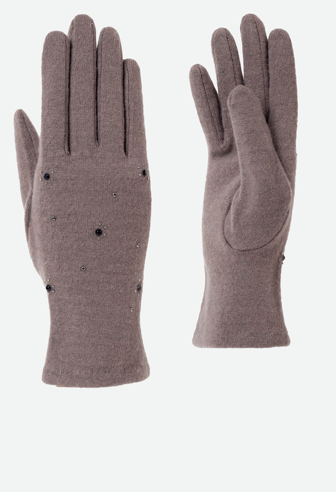 Перчатки выполнены из трикотажной шерсти. Состав трикотажа: 80% шерсть, 20% нейлон. Без подкладки. На лицевой стороне перчатки декоративная отделка из мелких страз в виде цветочков. Длина манжеты от нижней точки большого пальца до края перчатки 6,5 см. Длина пальцев - средняя.