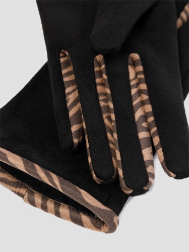Модель выполнена с тонкой и теплой подкладкой из флиса. Отделка - контрастные вставки между пальцами и по краю манжеты с анималистичным принтом. Длина манжеты от нижней точки большого пальца до края перчатки - 6 см. Длина пальцев - средняя.
