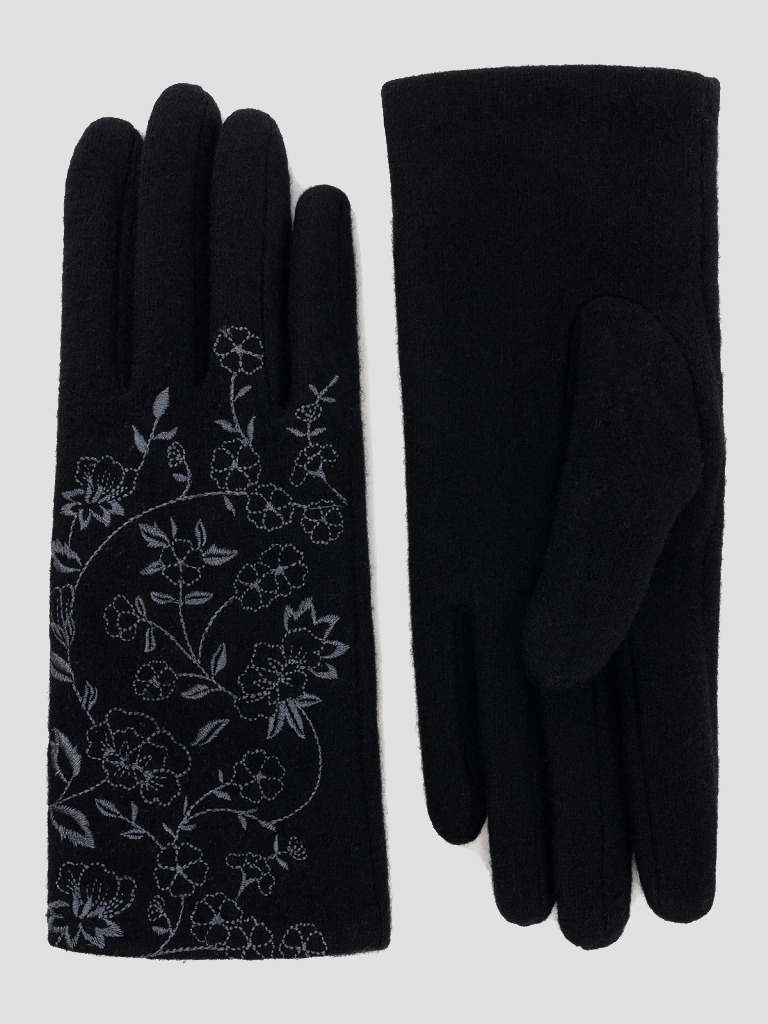 Модель без подкладки. Отделка - лицевая сторона украшена декоративной вышивкой. Длина манжеты от нижней точки большого пальца до края перчатки - 6 см. Длина пальцев - средняя.