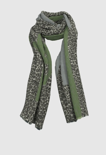 Стильный прямоугольный шарф в виде животных с надписью и зелеными акцентами. Размер примерно 70 х 180 см.