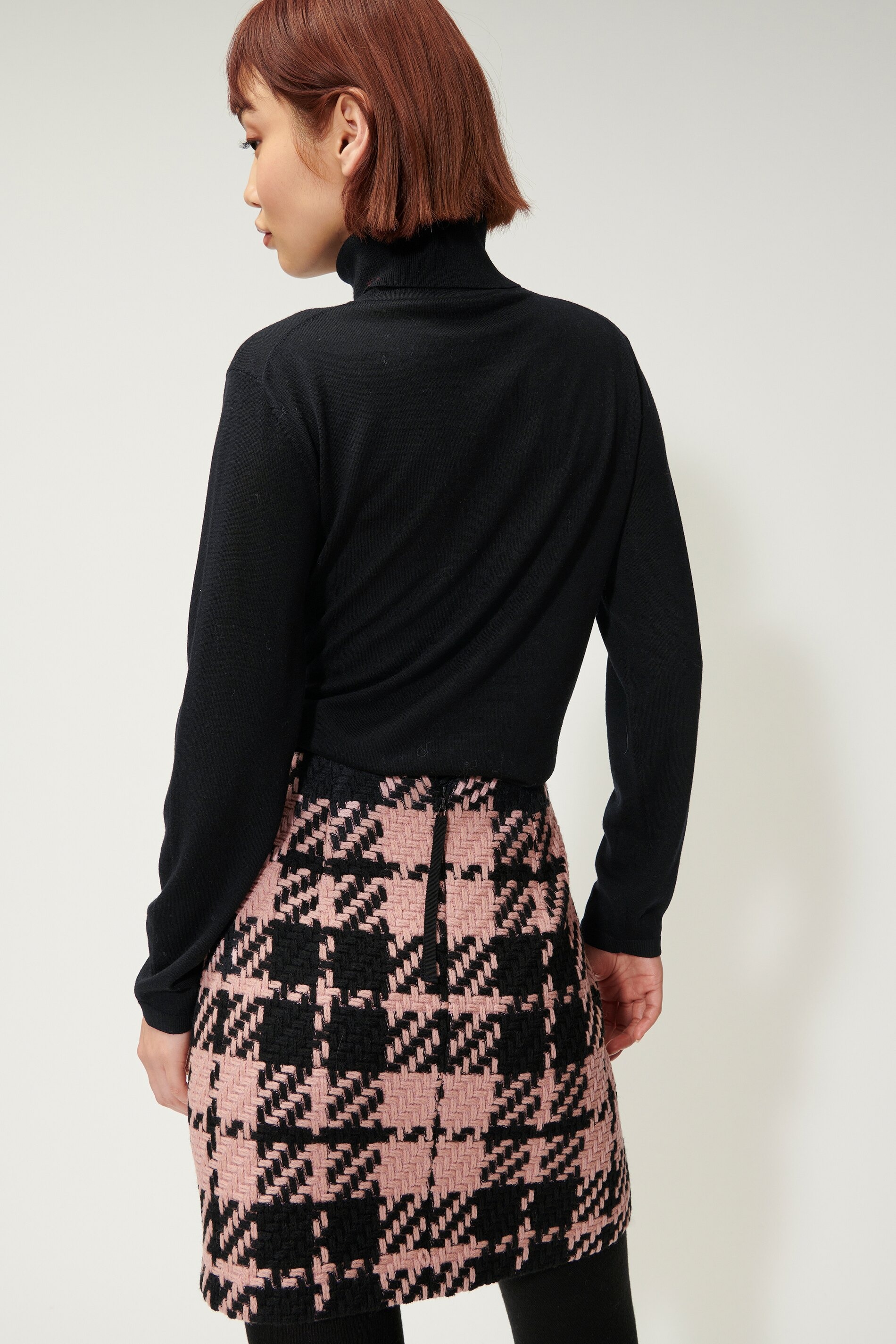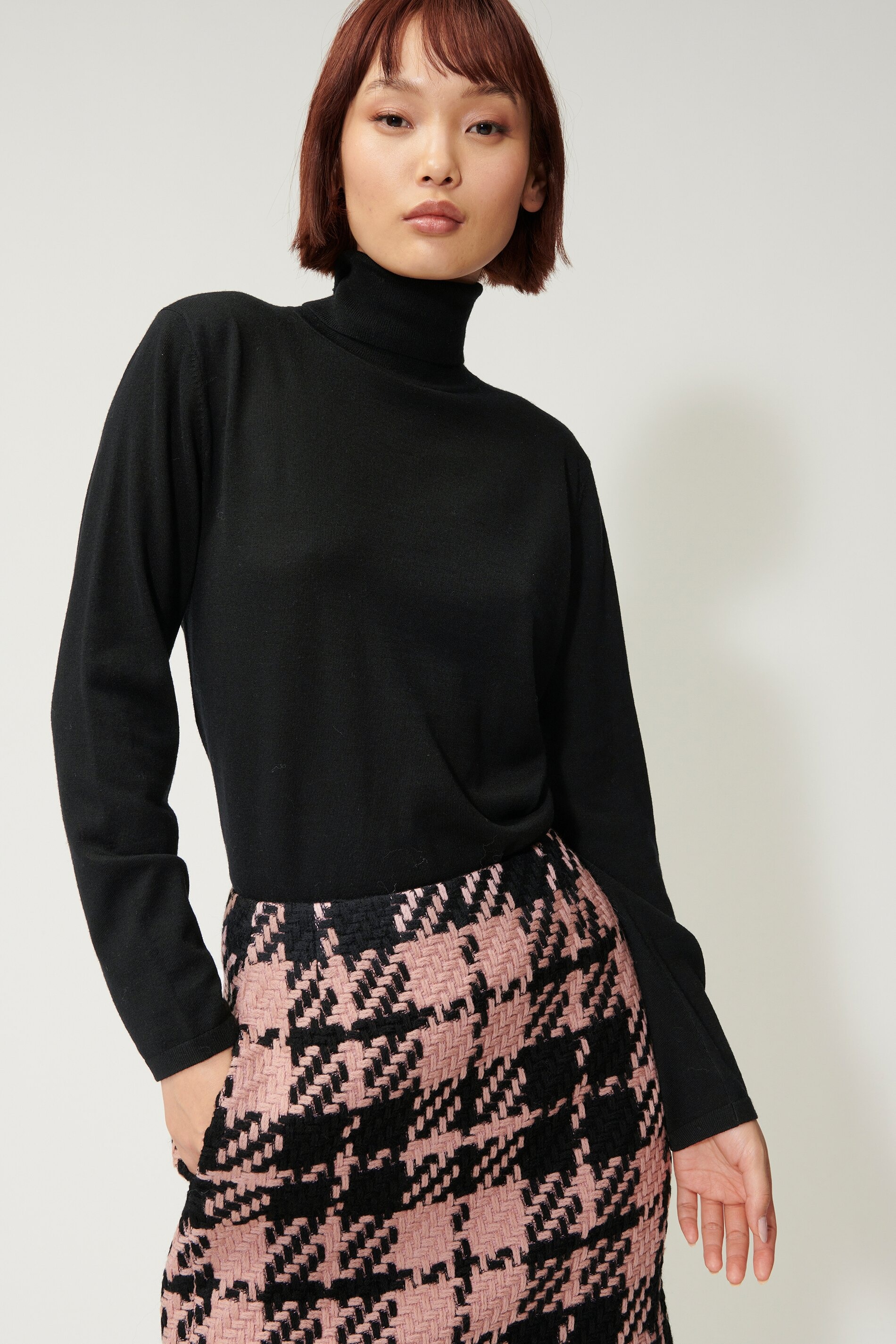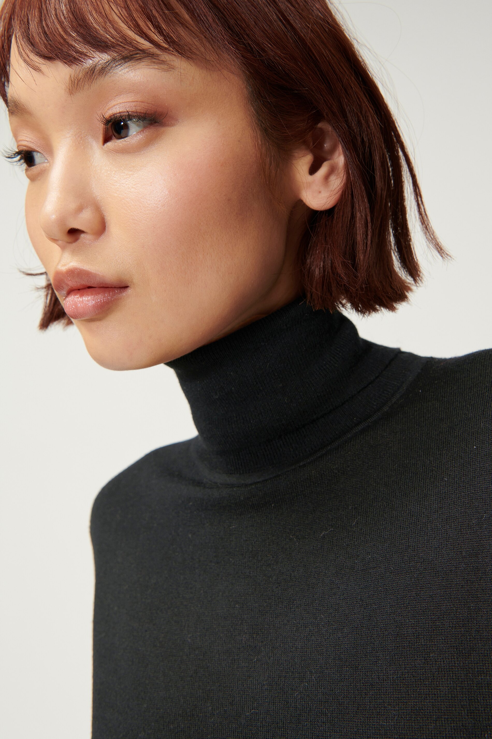 Пуловер с высоким воротником из изысканной ткани тонкой вязки с моделирующими деталями и ребристой отделкой. Содержание шелка в ткани обеспечивает ощущение особенной мягкости.