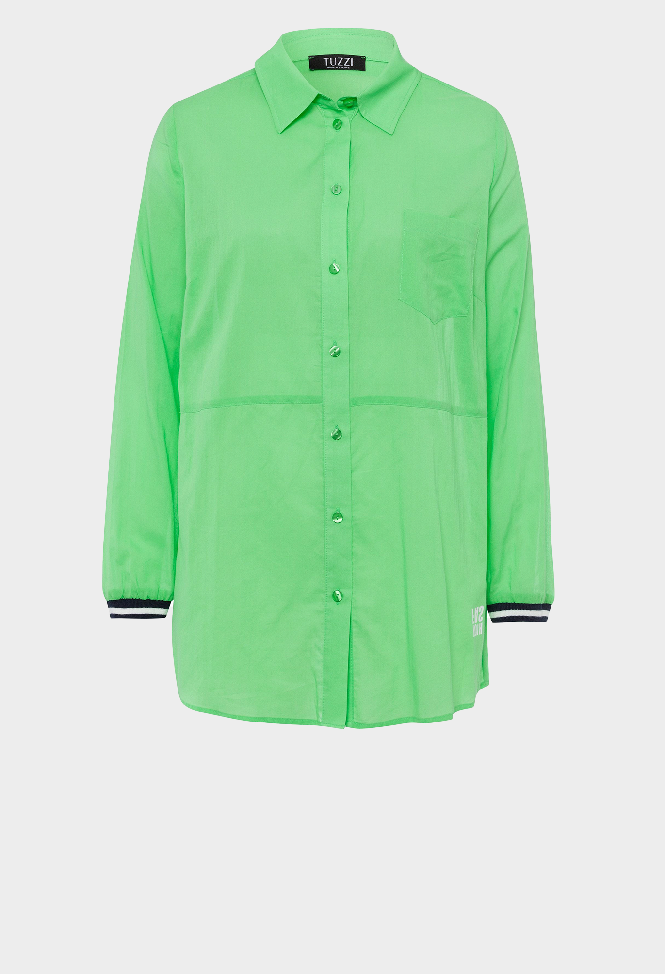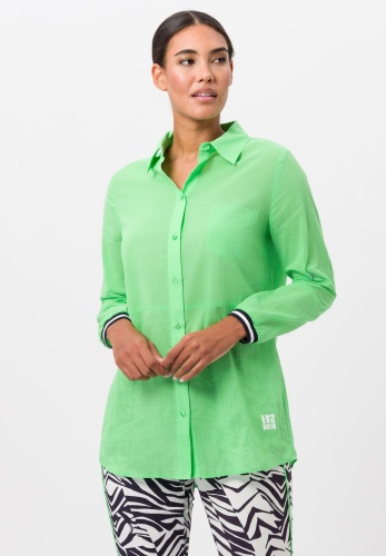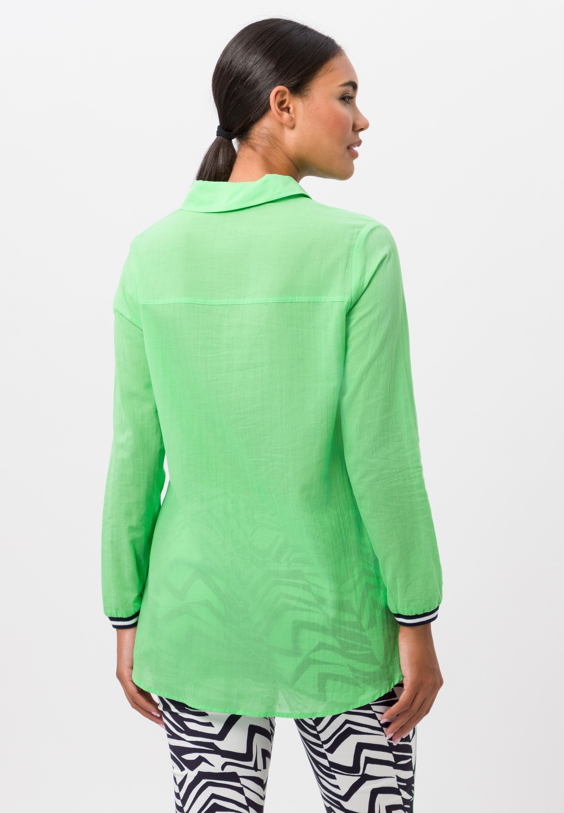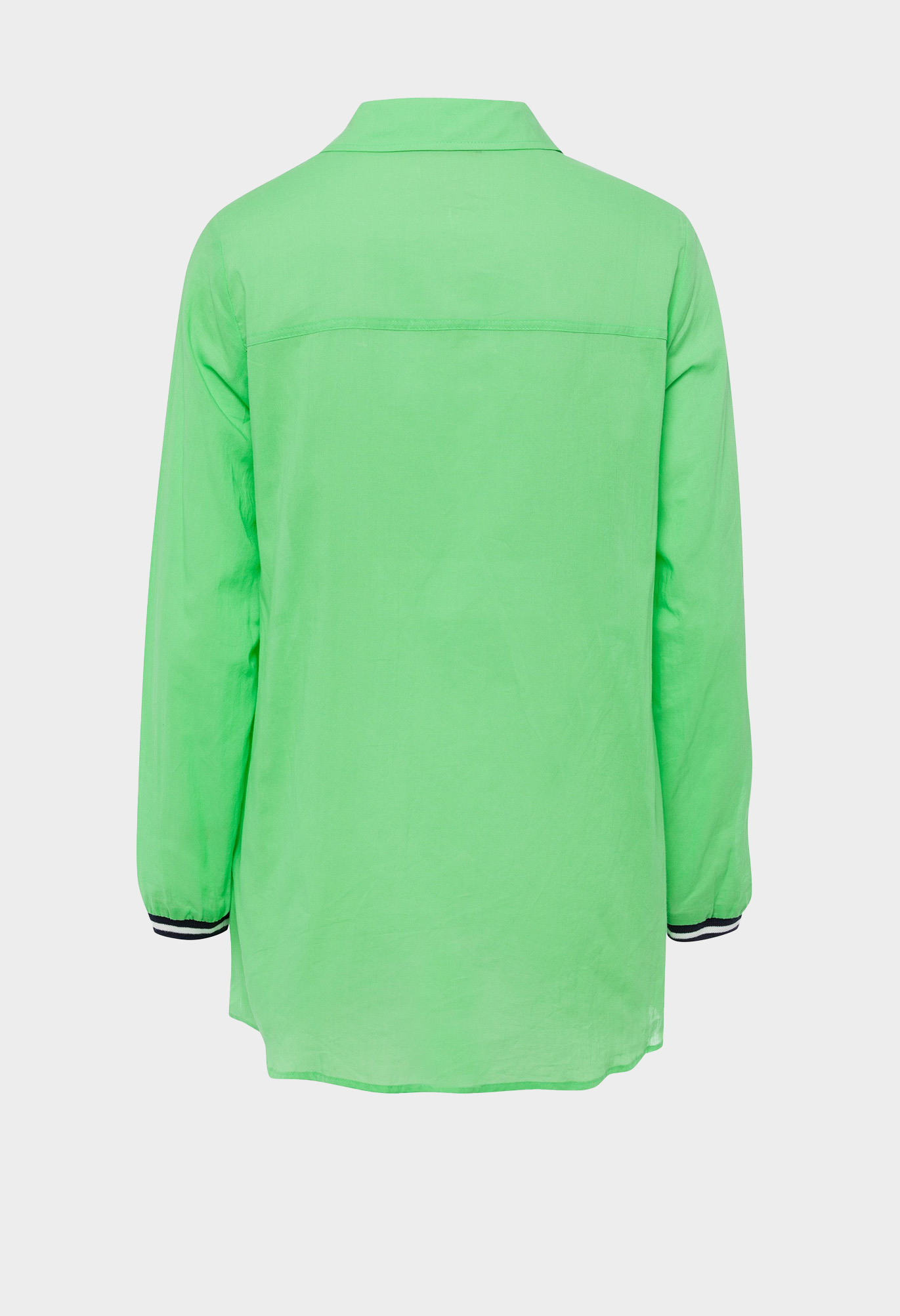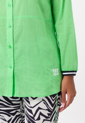 Длинная женская блузка с контрастными манжетами. В дополнение к своим классическим особенностям, таким как воротник блузки, планка на пуговицах и нагрудный карман, элегантный дизайн блузки представлен в спортивном стиле полосатыми контрастными манжетами на рукавах и небольшим принтом над подолом. Длинная модель, облегающая фигуру, и легкая хлопчатобумажная ткань чрезвычайно удобны в носке. Длина - 76 см.