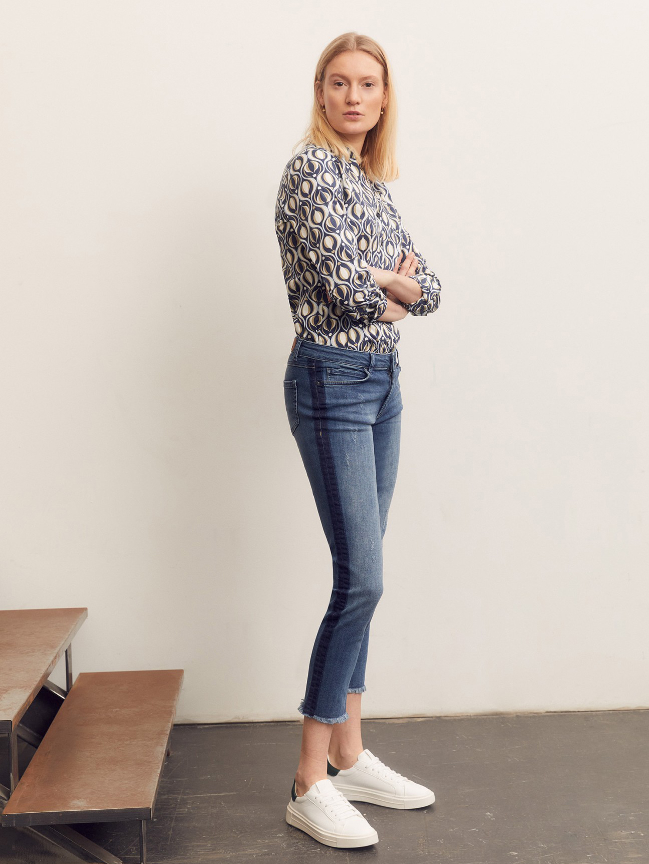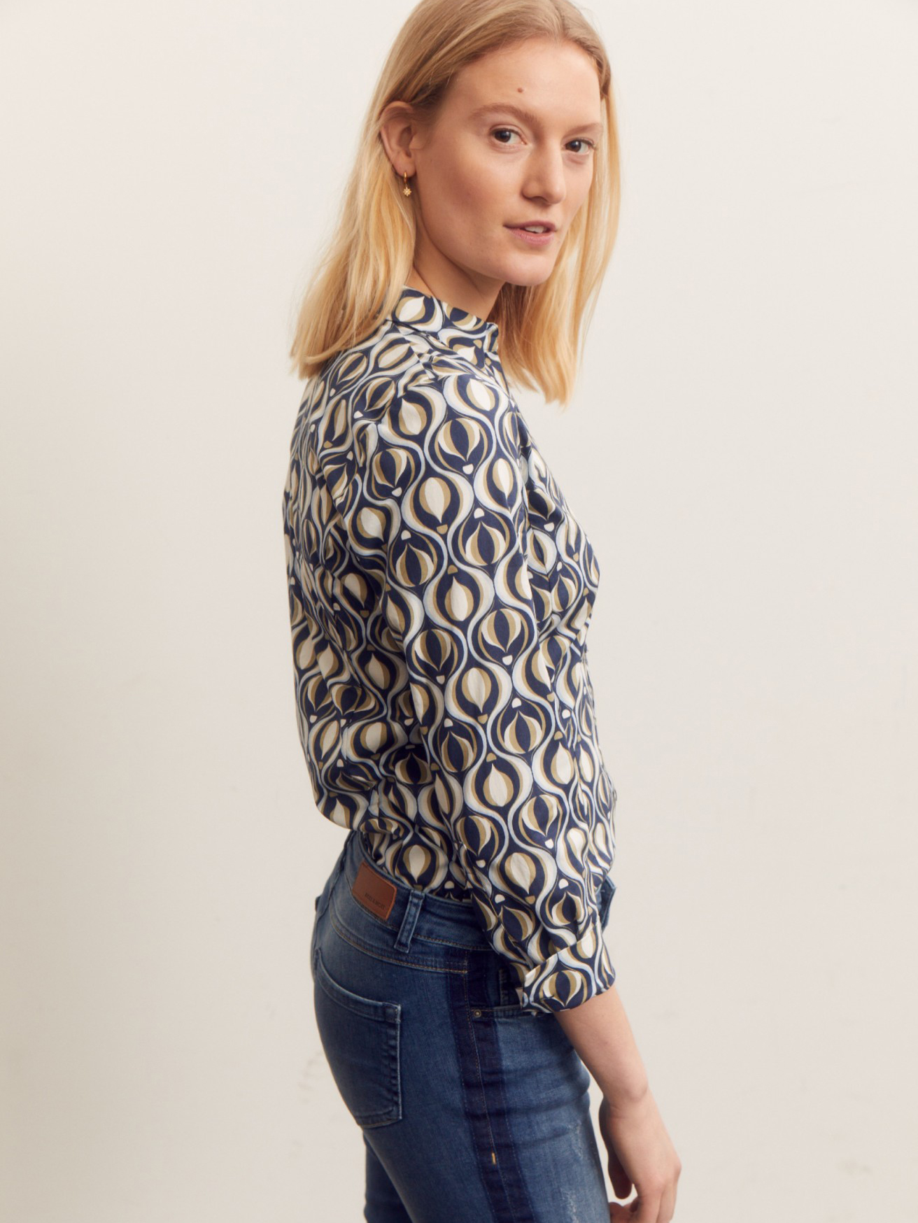 Классический крой рубашки интересно сочетается с современным принтом. Совместите стильную блузу с выцветшими джинсами, белыми брюками чинос или темно-синими деловыми брюками. - приталенный крой - планка с узкими пуговицами - манжеты на пуговицах - длина по размеру 42 = 66 см