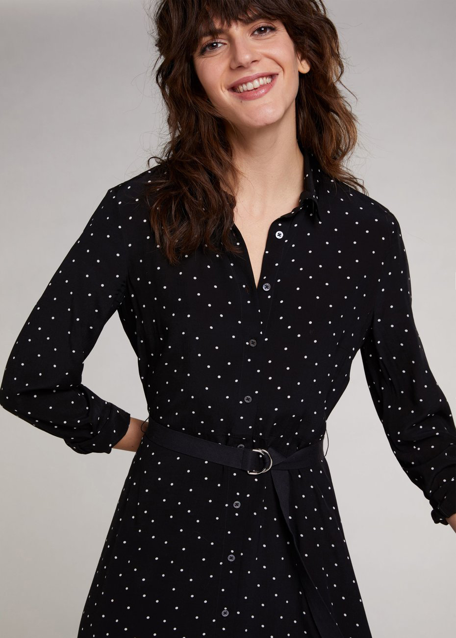 Платье длины макси в мелкий горох. Отложной рубашечный воротник, планка с пуговицами. Втачной рукав полной длины с манжетой. В комплекте идет черный тканевый пояс.