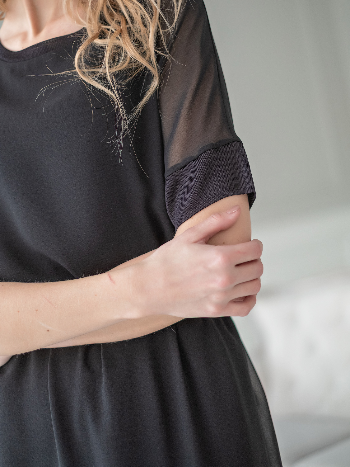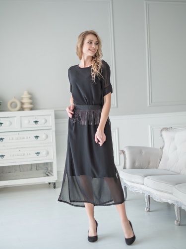 Двуслойное черное платье можно стильно сочетать с любыми аксессуарами! Нижний слой длиной выше колена, без рукавов. Верхний слой из легкой полупрозрачной сетки длины миди.