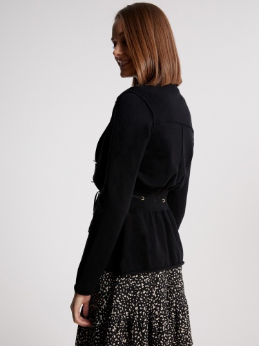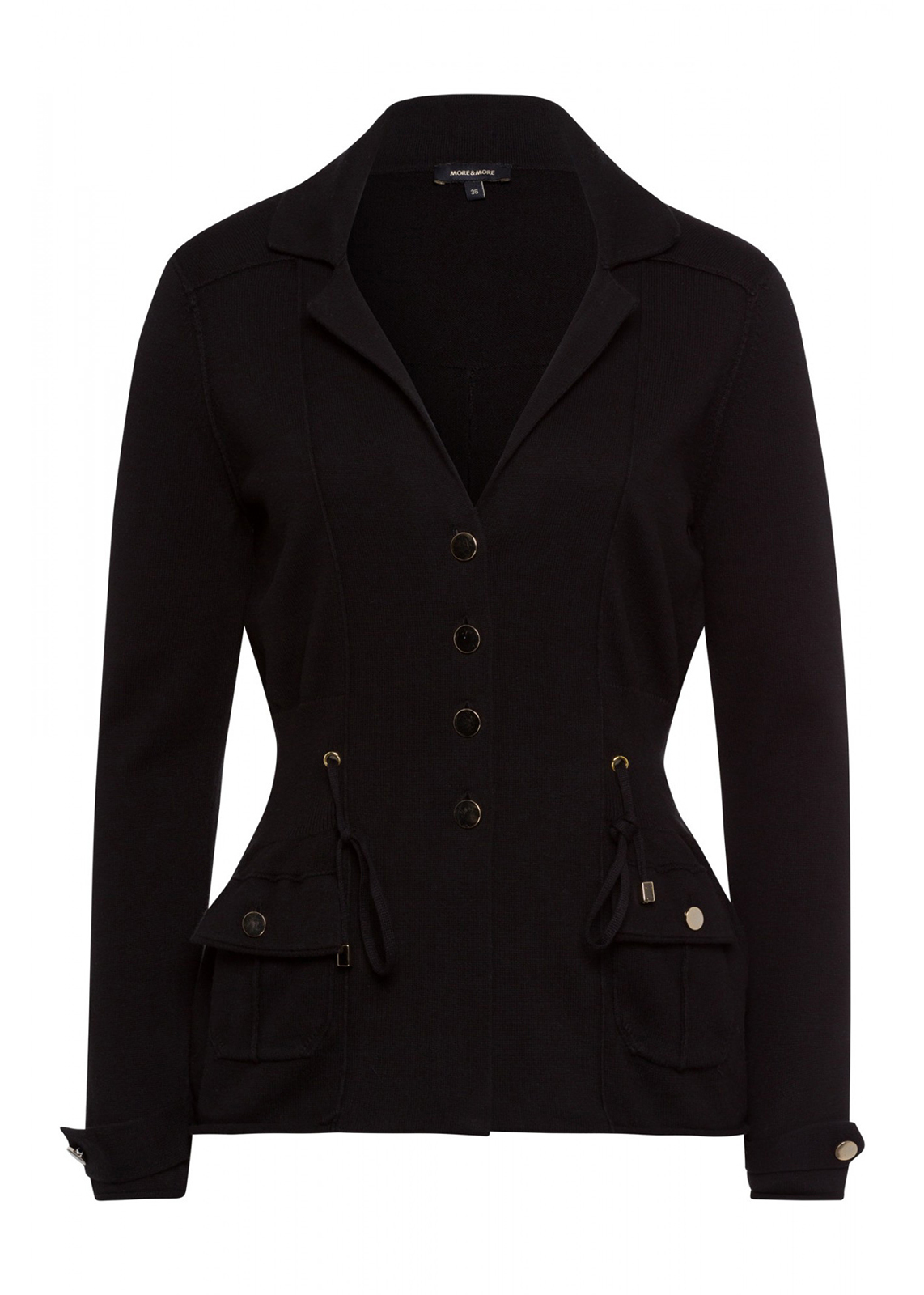 Черный жакет приталенного силуэта. Накладные карманы с клапаном. Втачной рукав полной длины с манжетами. Английский воротник.