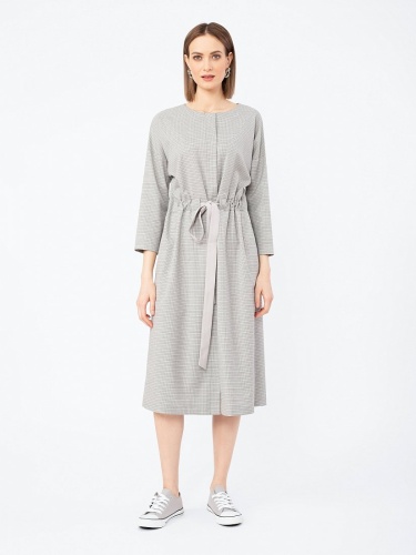 Платье в городском стиле идеально для повседневного ношения. Длина миди, полуприлегающий силуэт. Акцент на талии за счет кулиски и пояса контрастного цвета. Супатная застежка на металлические кнопки, боковые карманы. Рубашечный рукав 3/4, круглый вырез горловины.