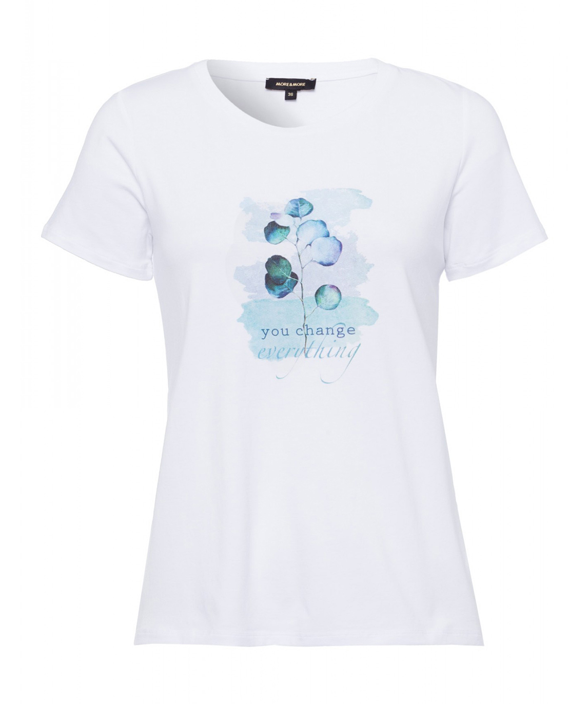 Базовая белая футболка с растительным принтом. Овальный вырез горловины, короткий втачной рукав.