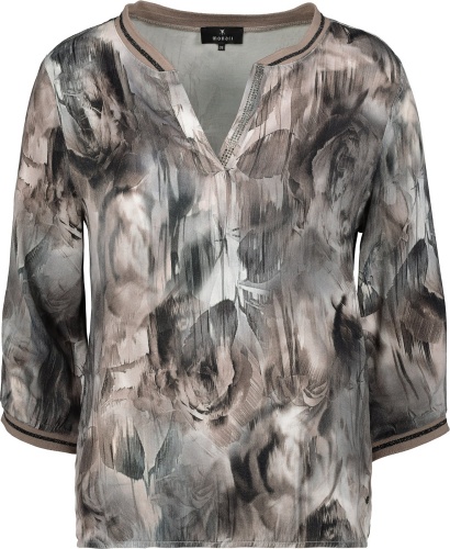 Блуза с абстрактым принтом. Втачной рукав 3/4 , v-образный вырез горловины украшен стразами.