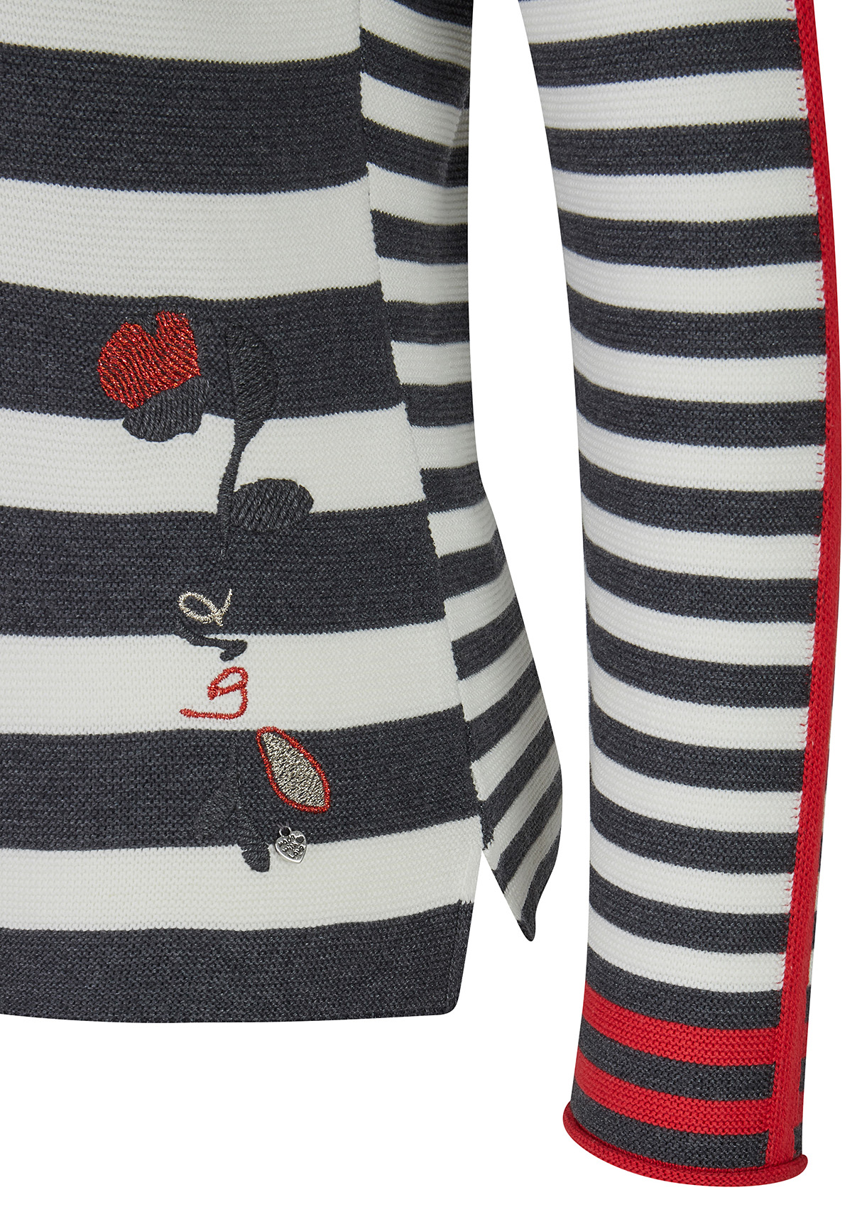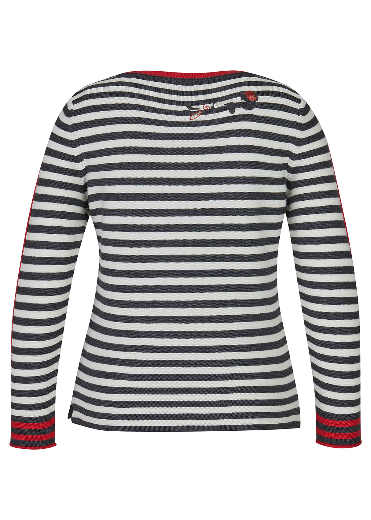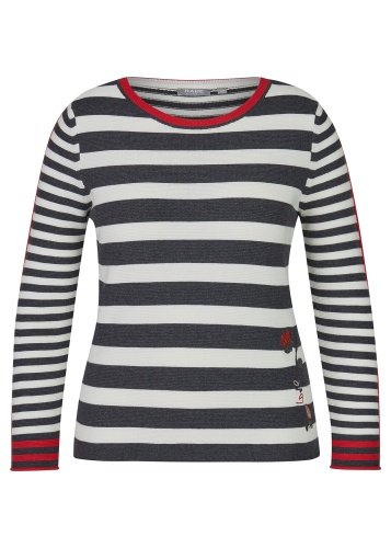 Джемпер полуприлегающего силуэта с круглым вырезом горловины и втачными рукавами полной длины. Полосатый дизайн с яркими акцентами на горловине и рукавах дополнен вышивкой на боку и на спинке. Материал из хлопковой смеси приятен к телу и удобен в ношении.
