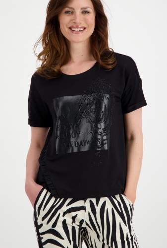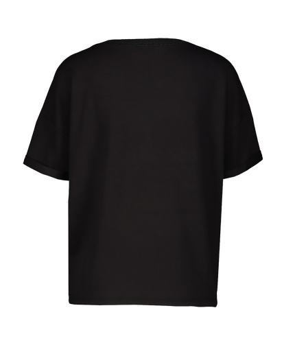 Однотонная футболка свободного силуэта – комфортный вариант для повседневного образа. Широкая круглая горловина. Втачной короткий рукав, спущенная линия плеча. Анималистичный принт в тон футболки.