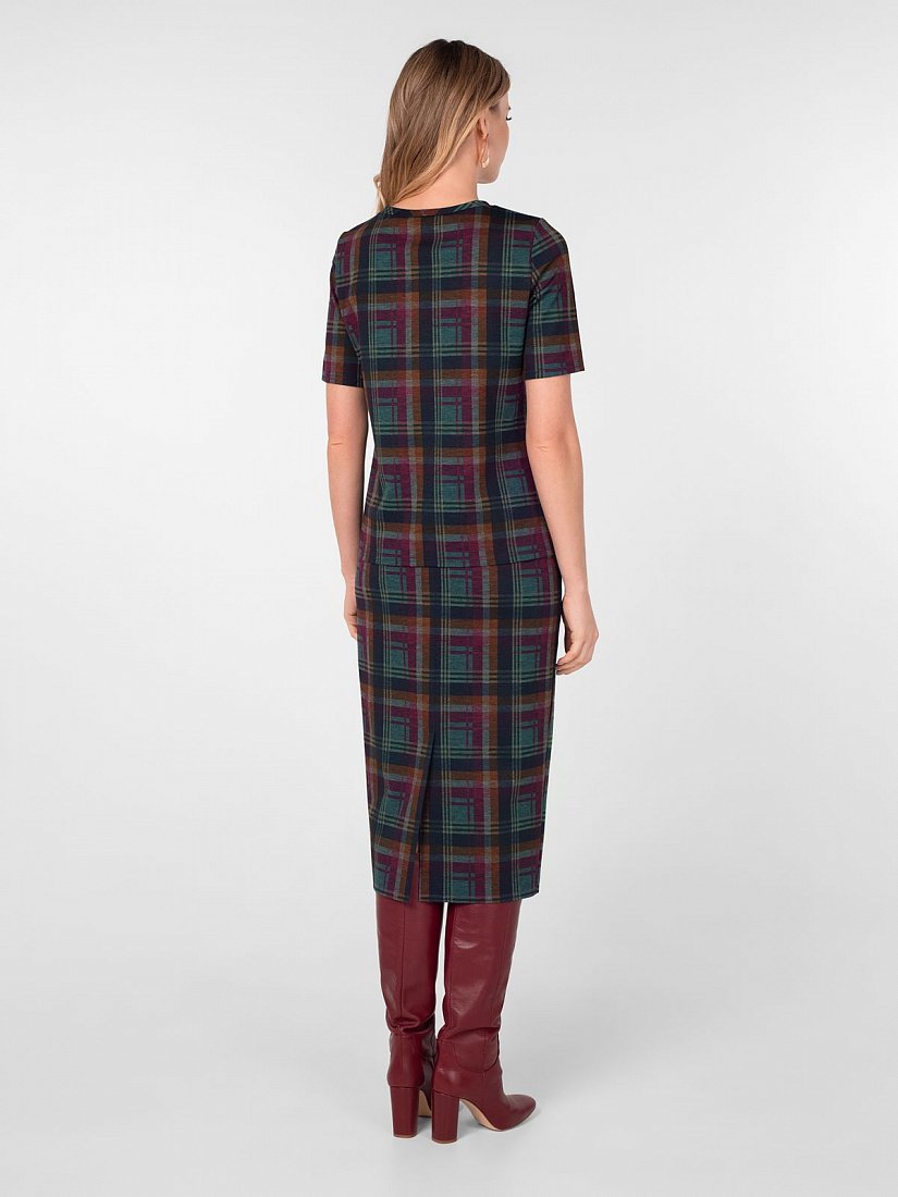 Блуза из трикотажного полотна в клетку прямого силуэта с круглой горловиной и коротким втачным рукавом. Без застежки.