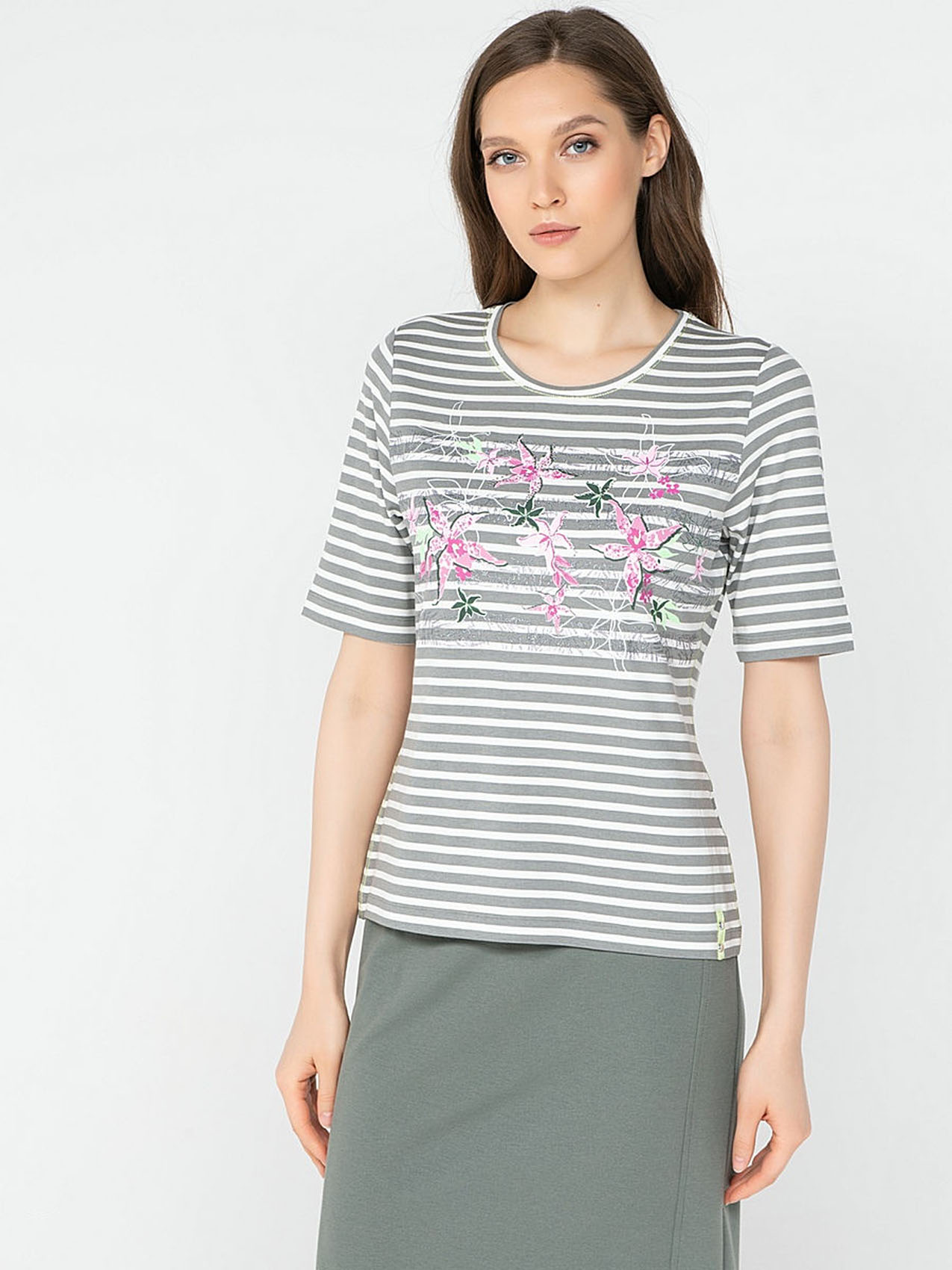 Полоска и тропические цветы - отличное сочетание трендовых мотивов! Приятный к телу материал из смеси вискозы и эластана гарантирует отличную посадку, а рукав 1/2 придает образу легкость и непринужденность. Футболка будет замечательным компаньоном как в брючном, так и в юбочном комплекте.