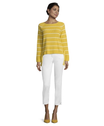 Новая вариация трендовой полоски! Джемпер прямого покроя с длинными рукавами и горловиной-лодочкой. Элемент романтического стиля - декоративные ленты-завязки по бокам. Материал из хлопковой смеси приятен к телу. Этот джемпер создает женственный образ даже в сочетании с брюками.