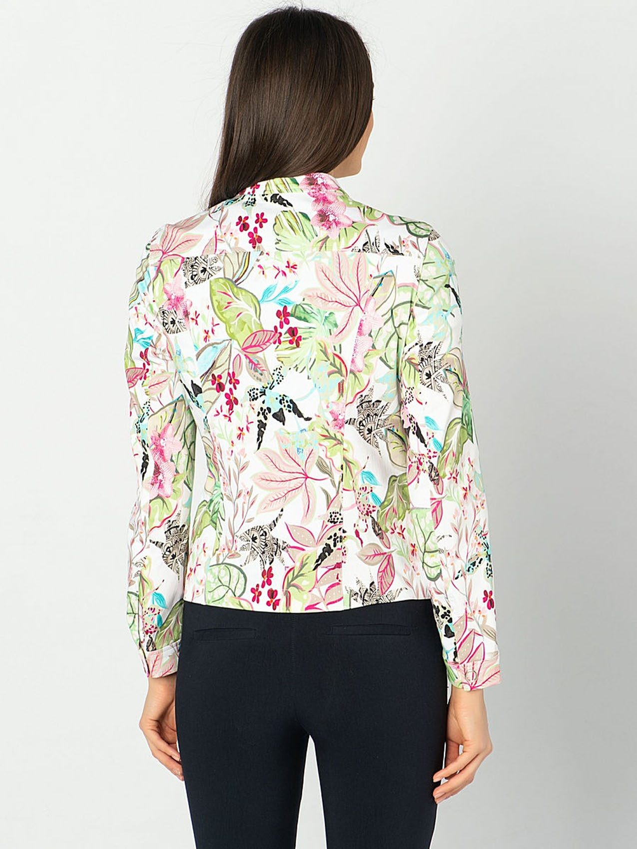 Светлый жакет с цветочным принтом создает весеннее настроение, так что даже в хмурый день ваша улыбка будет сиять. Хлопковый материал с примесью эластана обеспечивает комфорт и отличную посадку. Слегка приталенный силуэт, воротник-стойка и кнопки - то, что нужно для отличного дизайна. Эта модель удачно сочетается как с брюками, так и с юбкой. Свежие цвета сделают ваш образ ярким!