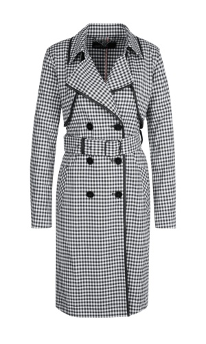 Клетчатый плащ длиной до колена. Английский воротник, втачные рукава. Застежка на пуговицах, пояс с пряжкой.