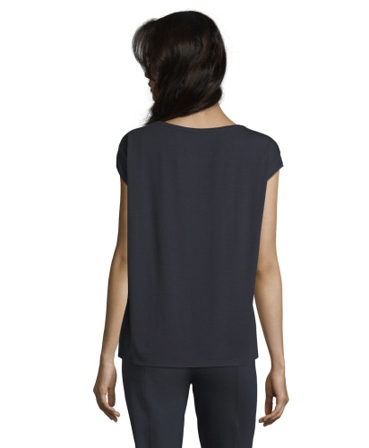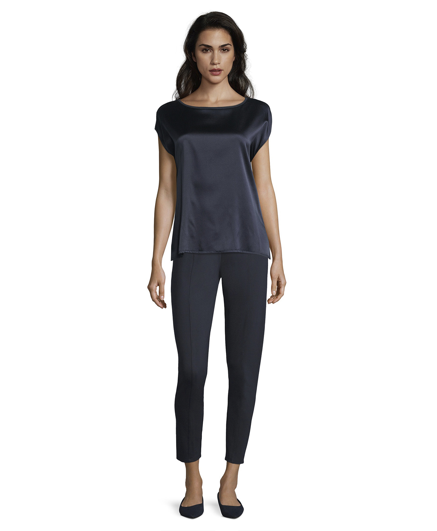 Однотонный топ - базовая модель, которая является обязательной вещью в любом гардеробе. Топ прямого покроя с вырезом-лодочкой и короткими цельнокроеными рукавами. Блестящий атласный перед изделия контрастирует с матовой спинкой. Материал из смеси шелка и эластана обеспечивает комфорт и идеально подходит для теплого времени года. В этом лаконичном и элегантном топе вы будете выглядешь шикарно, независимо от выбранного варианта низа и обуви.