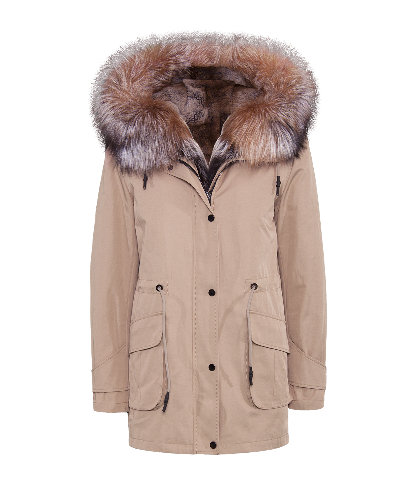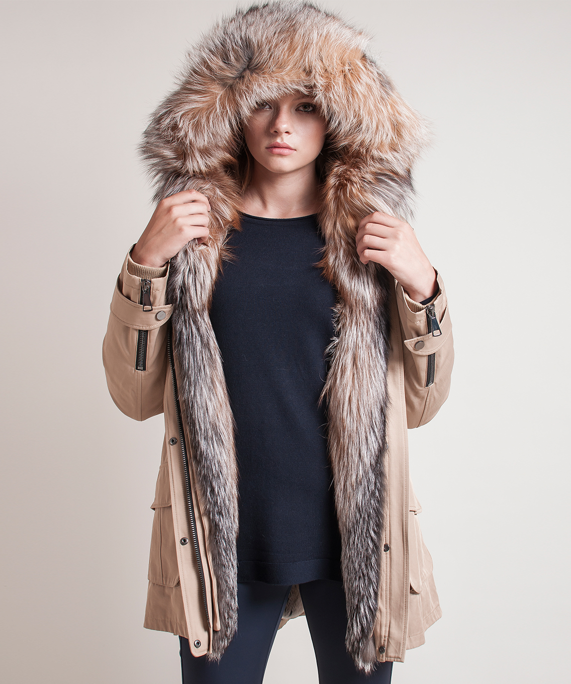 Теплая пихора на подкладке из натурального меха кролика. Плотная ткань верха. Прямой покрой, кулиска на талии. Удлиненная спинка, замки-молнии по бокам. Накладные карманы на клапанах. Рукава декорированы замками и патой на кнопке. Оторочка капюшона из натурального лисьего меха.