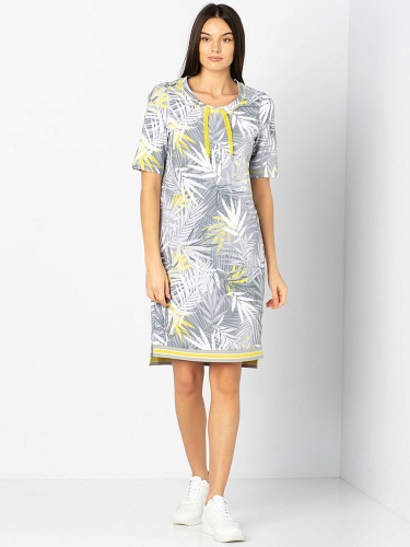 Платье миди. Круглый вырез горловины с желтыми завязками. Рукав 1/2. Удлиненная спинка, небольшие разрезы по бокам, отделка по низу изделия. Принт с тропическими мотивами, яркие цветовые акценты. Приятный к телу материал из смеси хлопка и эластана.