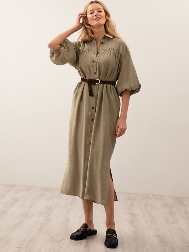 Платье прямого силуэта,удлиненное . С центральной застежкой на пуговицы.Рукав втачной с резинкой по низу. По переду кокетка со сборкой. В комплекте идет ремень из экокожи.