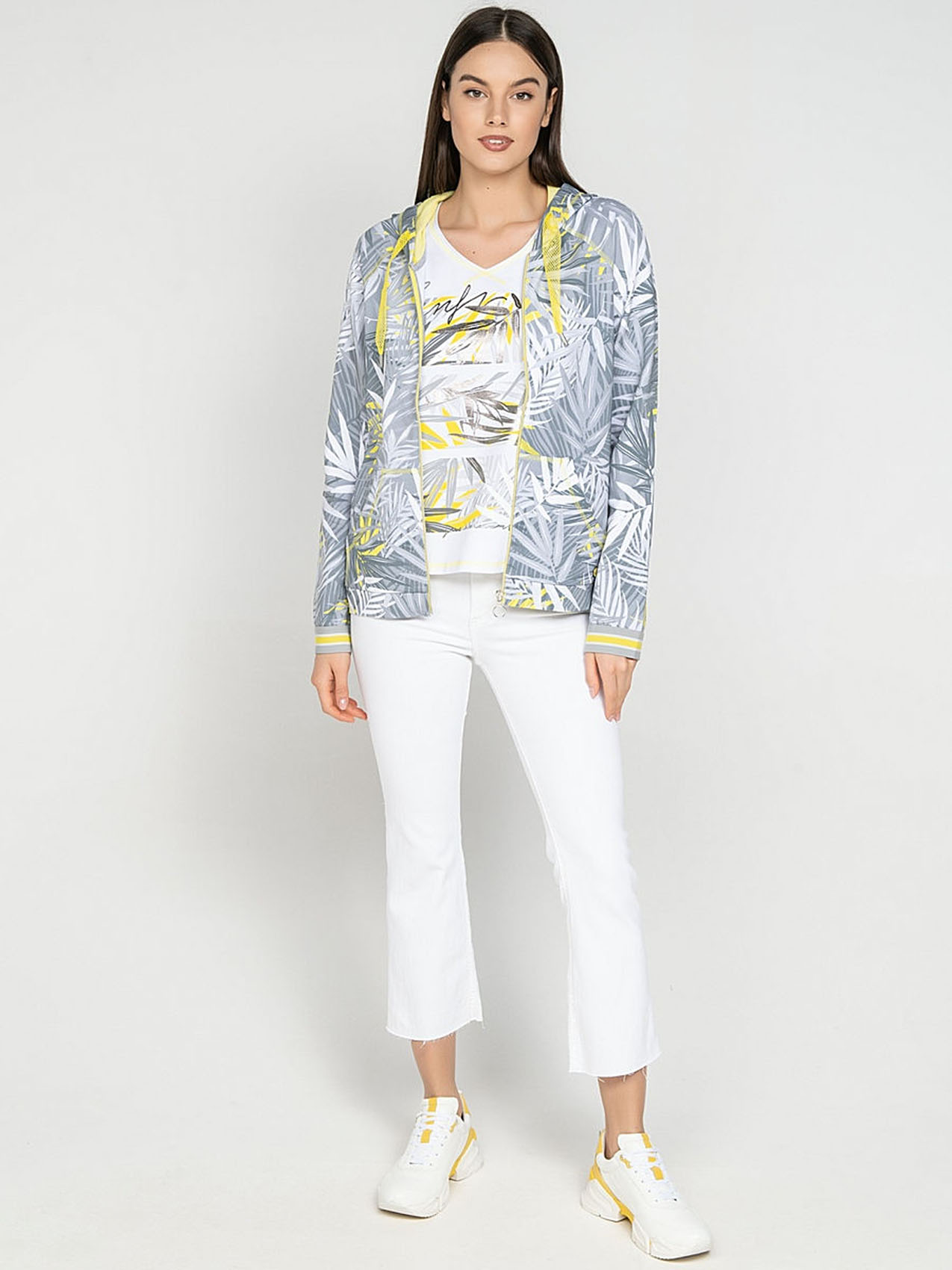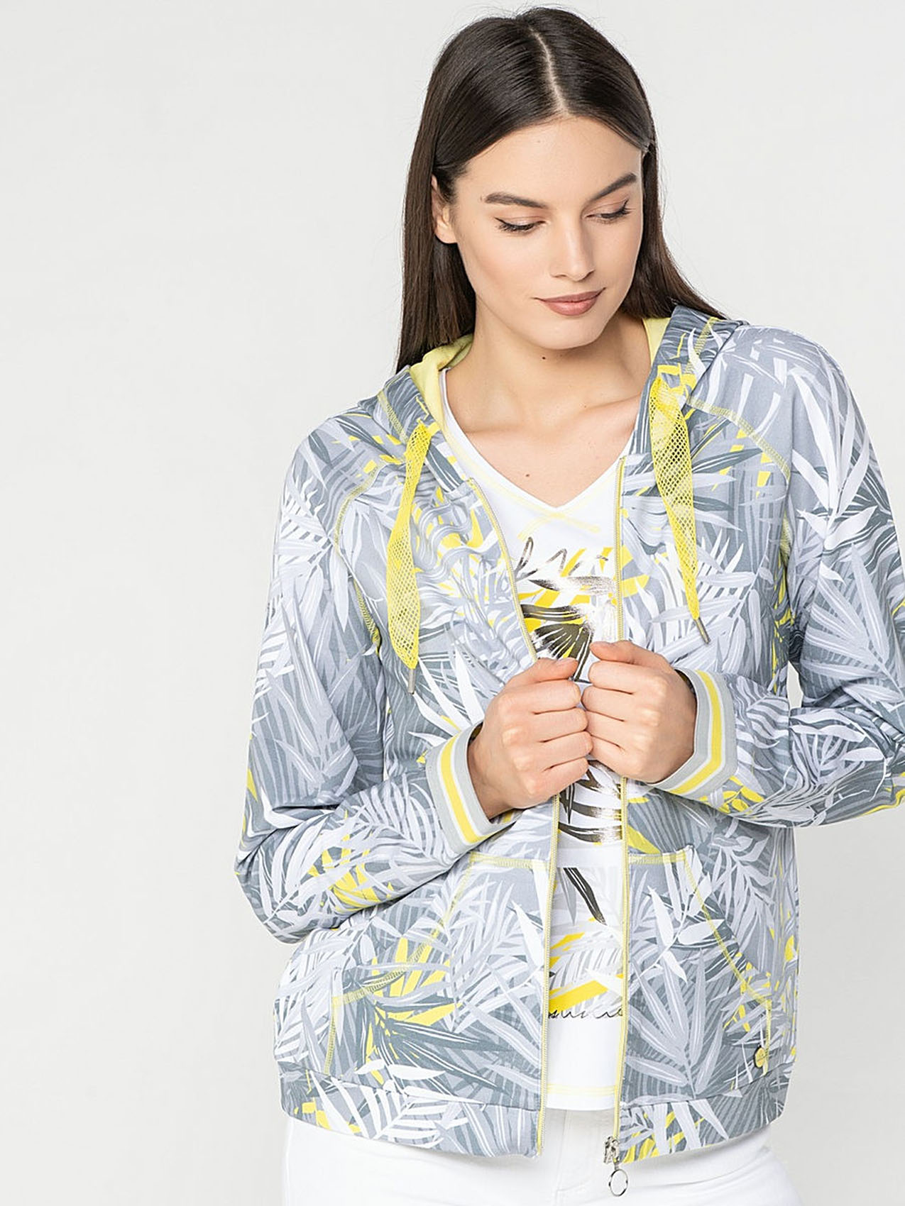 Блейзер с капюшоном. Трендовый принт с тропическими мотивами. Длинные рукава с трикотажными манжетами. Прорезные карманы. Замок-молния. Приятный к телу материал из смеси хлопка и эластана. Длина изделия по спинке: 67 см.