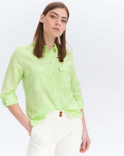 Однотонная блузка нежного салатового оттенка отлично впишется в гардероб любой современной женщины. Материал из смеси льна и хлопка приятен к телу и обеспечивает правильную терморегуляцию. Отложной рубашечный воротник, накладные нагрудные карманы с клапаном. Втачной рукав полной длины с манжетой.