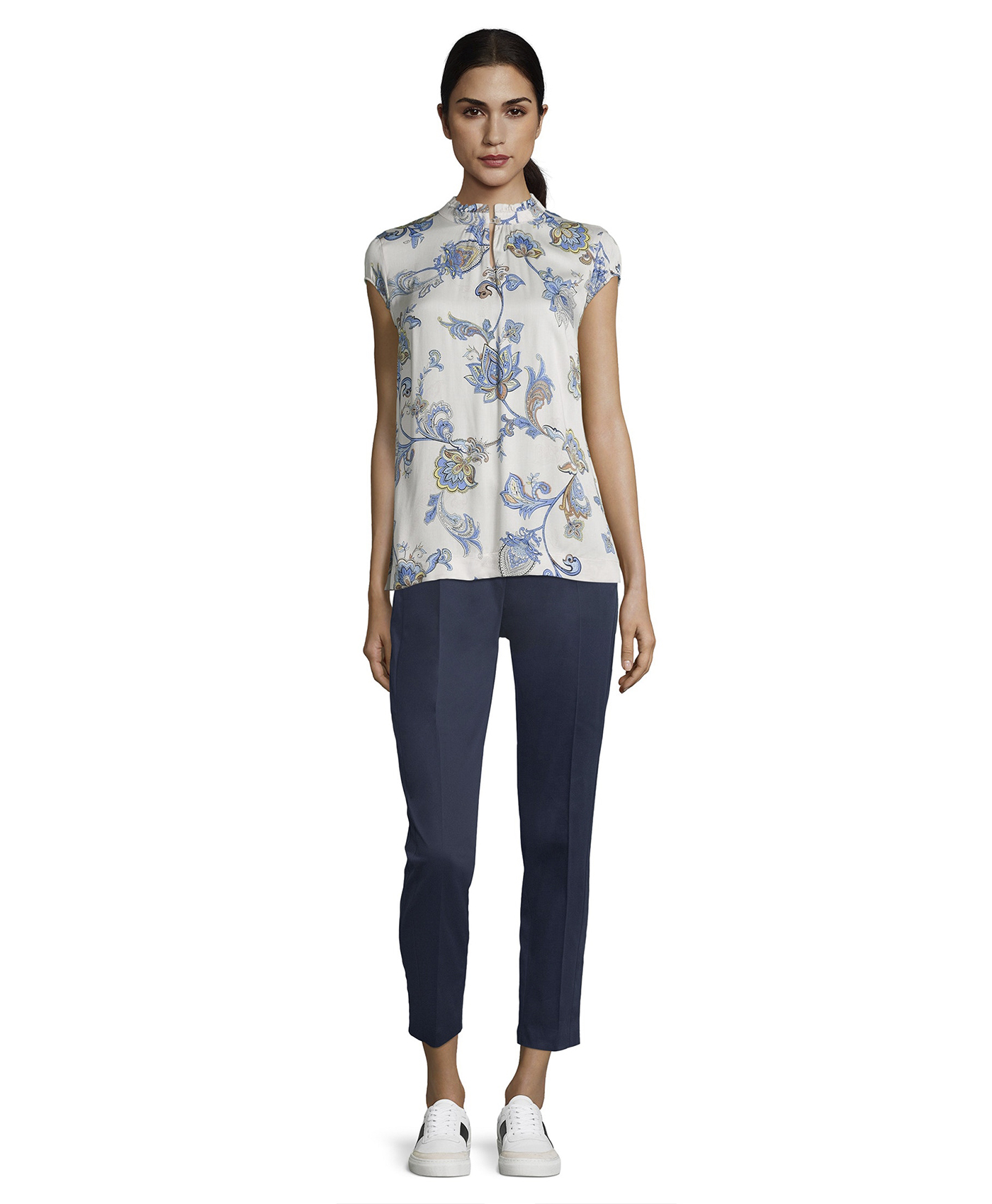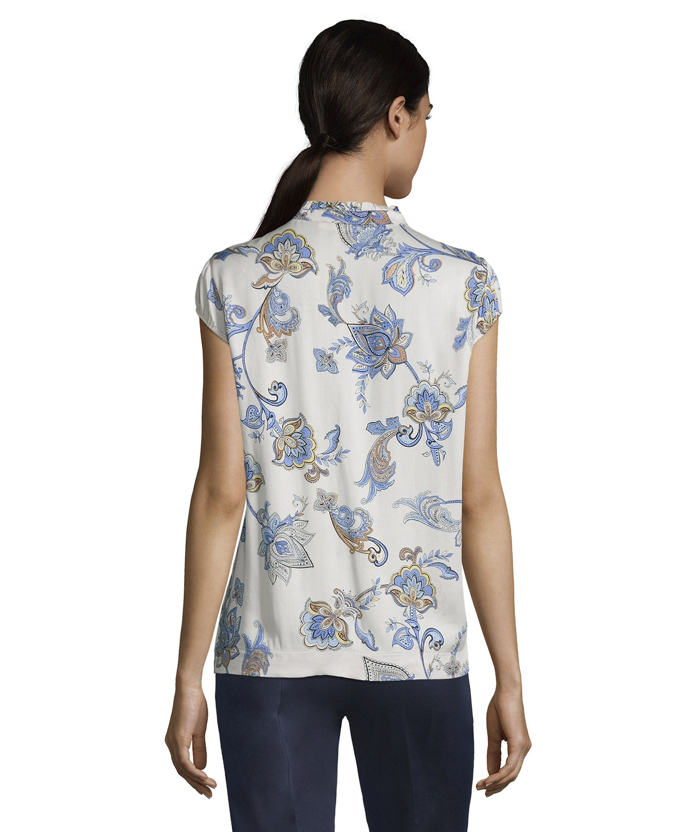 Блуза с цветочным принтом - дизайн на все времена! Прямой покрой, воротник-стойка в китайском стиле, короткие рукава. Вискозный материал приятен к телу и обеспечивает максимальный комфорт. Эта блуза прекрасно смотрится как в брючном, так и в юбочном комплекте.