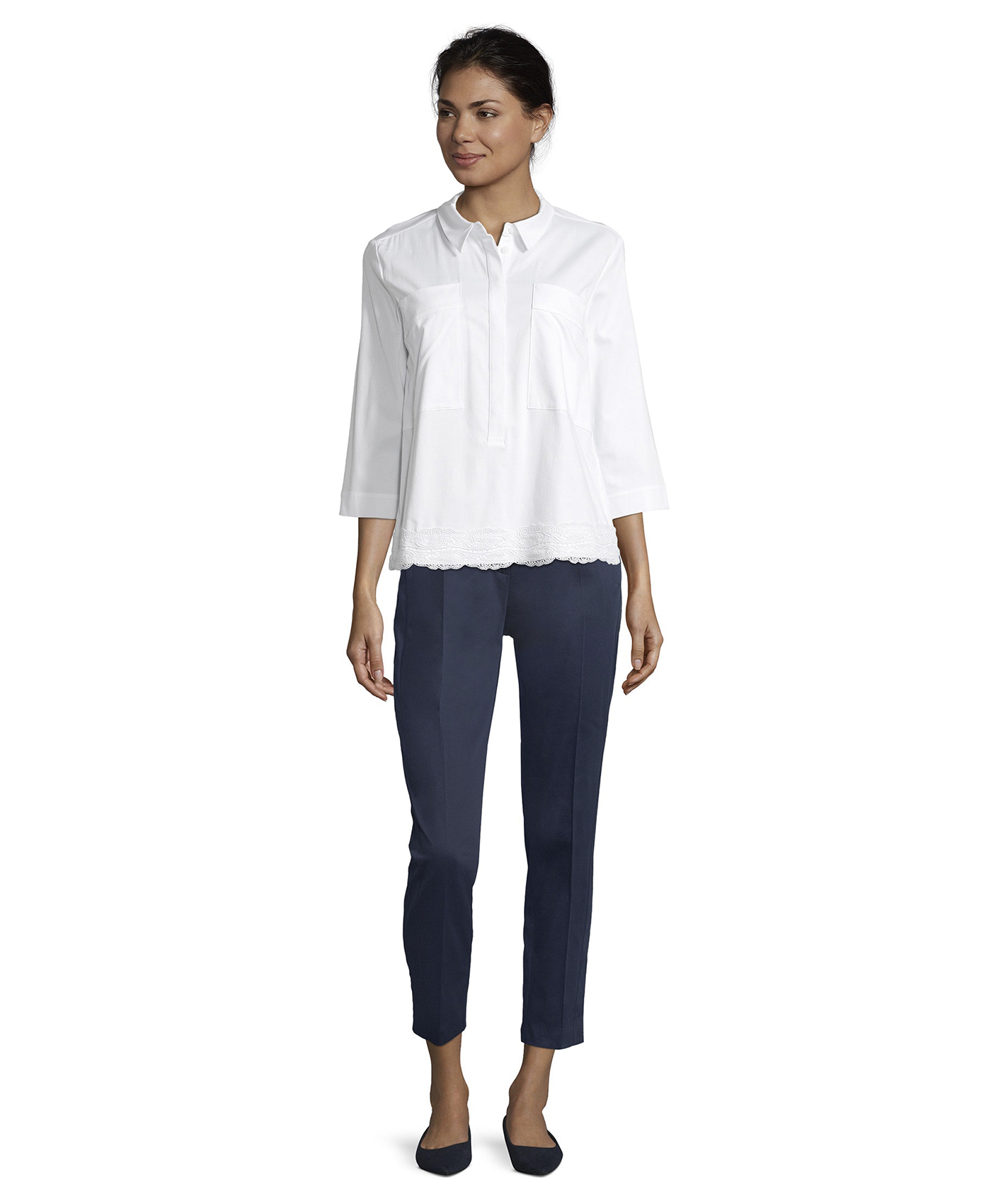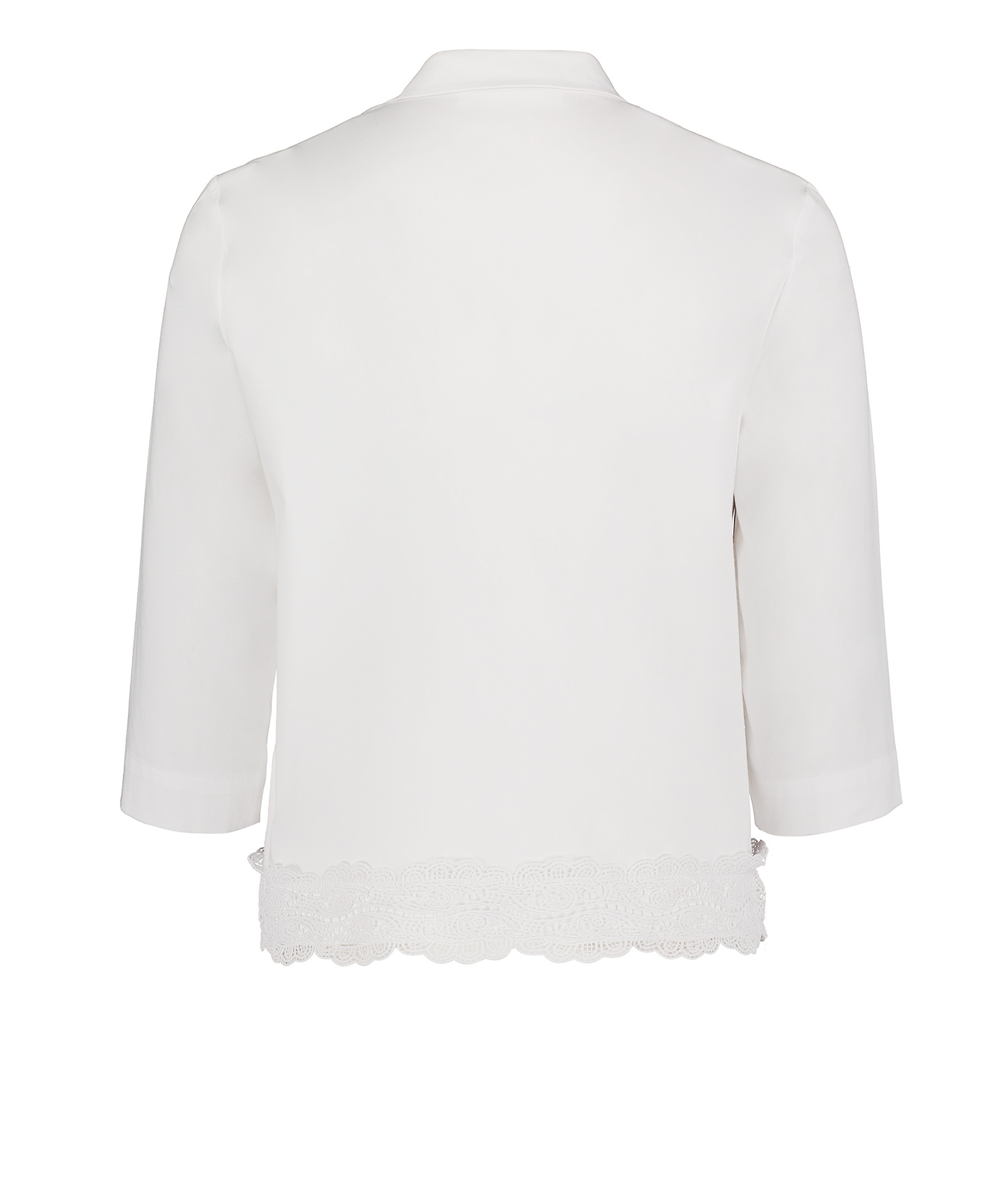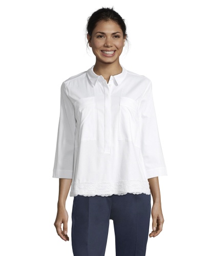 Белая блуза - это совсем не скучно! Прямой покрой, отложной воротничок, рукава 3/4, карманы на груди. Отделка кружевом по низу изделия подчеркивает женственность обладательницы блузы. Приятный к телу материал из хлопковой смеси обеспечивает комфорт. Эта элегантная блуза отлично смотрится с брюками и любой обувью.