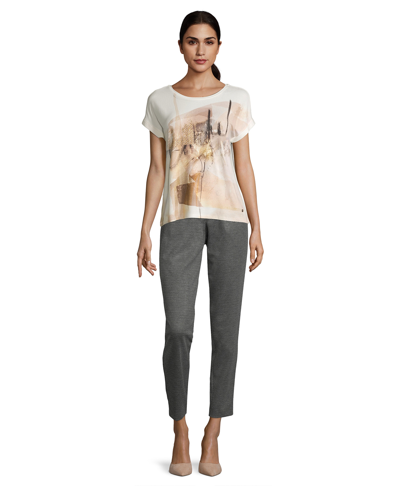 Топ с абстрактным принтом создает яркий образ. Прямой покрой, круглый вырез горловины, короткие рукава с фиксированными манжетами. Спинка изделия выполнена из однотонного материала с металлизированным принтом. Приятный к телу материал из вискозной смеси обеспечивает комфорт. Этот топ прекрасно смотрится в любом комплекте одежды.