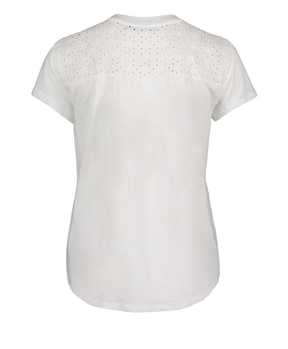 Эта стильная футболка создает романтический образ. Прямой покрой, V-образный вырез, короткие рукава, удлиненная спинка изделия. Ажурные вставки на кокетке переда и спинки изделия подчеркивают женственность обладательницы футболки. Материал из смеси хлопка и модала приятен к телу и обеспечивает комфорт. Эта футболка отлично сочетается как с брюками, так и с юбкой.