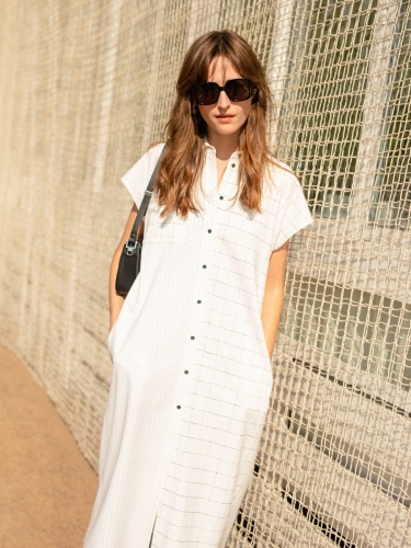 Платье из вискозной смеси в принте прямого силуэта с коротким рукавом кимоно, отложным воротником и застежкой спереди на пуговицы. В комплект входит съемный пояс из основной ткани. Спереди накладной карман прямоугольной формы.