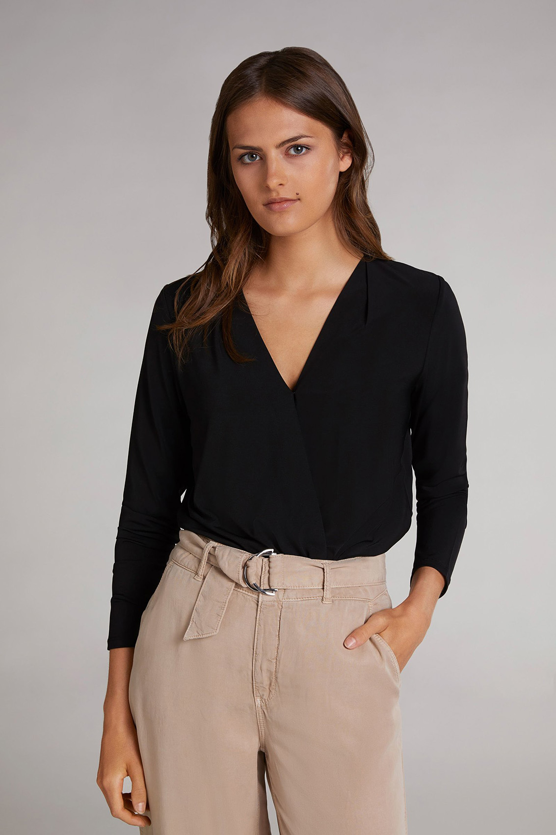 Однотонная блуза прямого покроя - обязательный элемент базового гардероба. Втачные рукава полной длины. V-образный вырез с имитацией запаха создает элегантный и женственный образ.