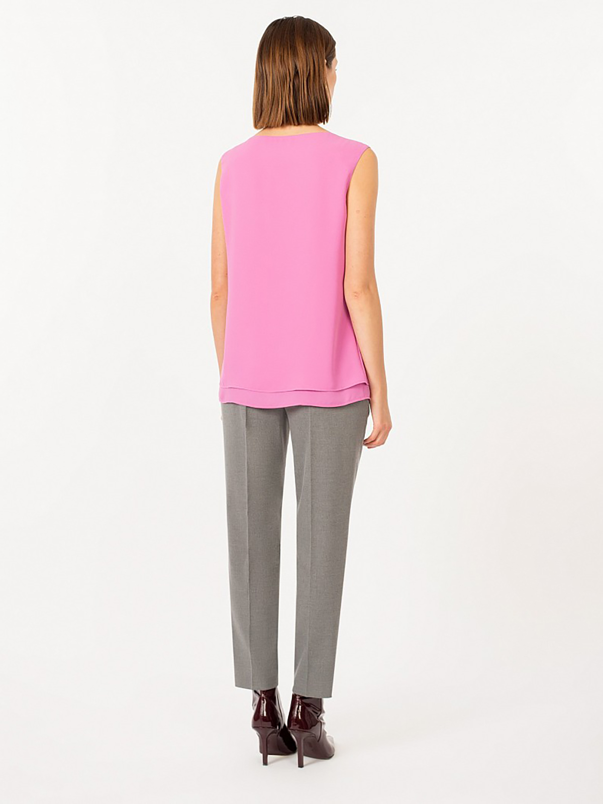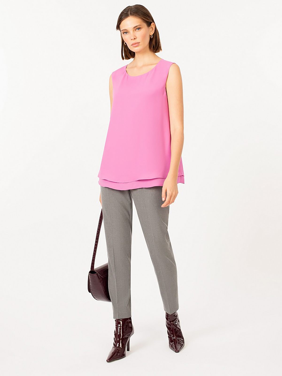 Блуза без рукавов в нежном розовом оттенке. Прямой крой идеально подходит для любого типа фигуры. Овальный вырез горловины подчеркивает линию шеи. Блузу предпочтительно носить навыпуск с брюками.