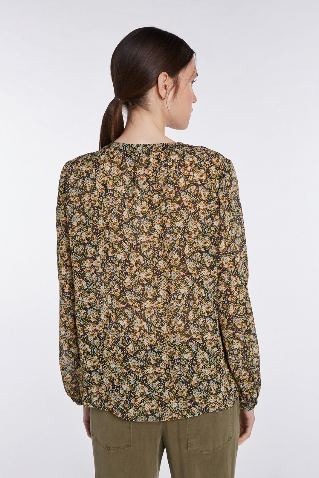 Блузка с красивым узором в стиле кэжуал. 100% экологически чистый вискозный шифон. Цветочный принт по всей поверхности. Круглый вырез и планка на потайных пуговицах. Полупрозрачный материал. Длина 42 российского размера: 64 см.