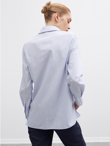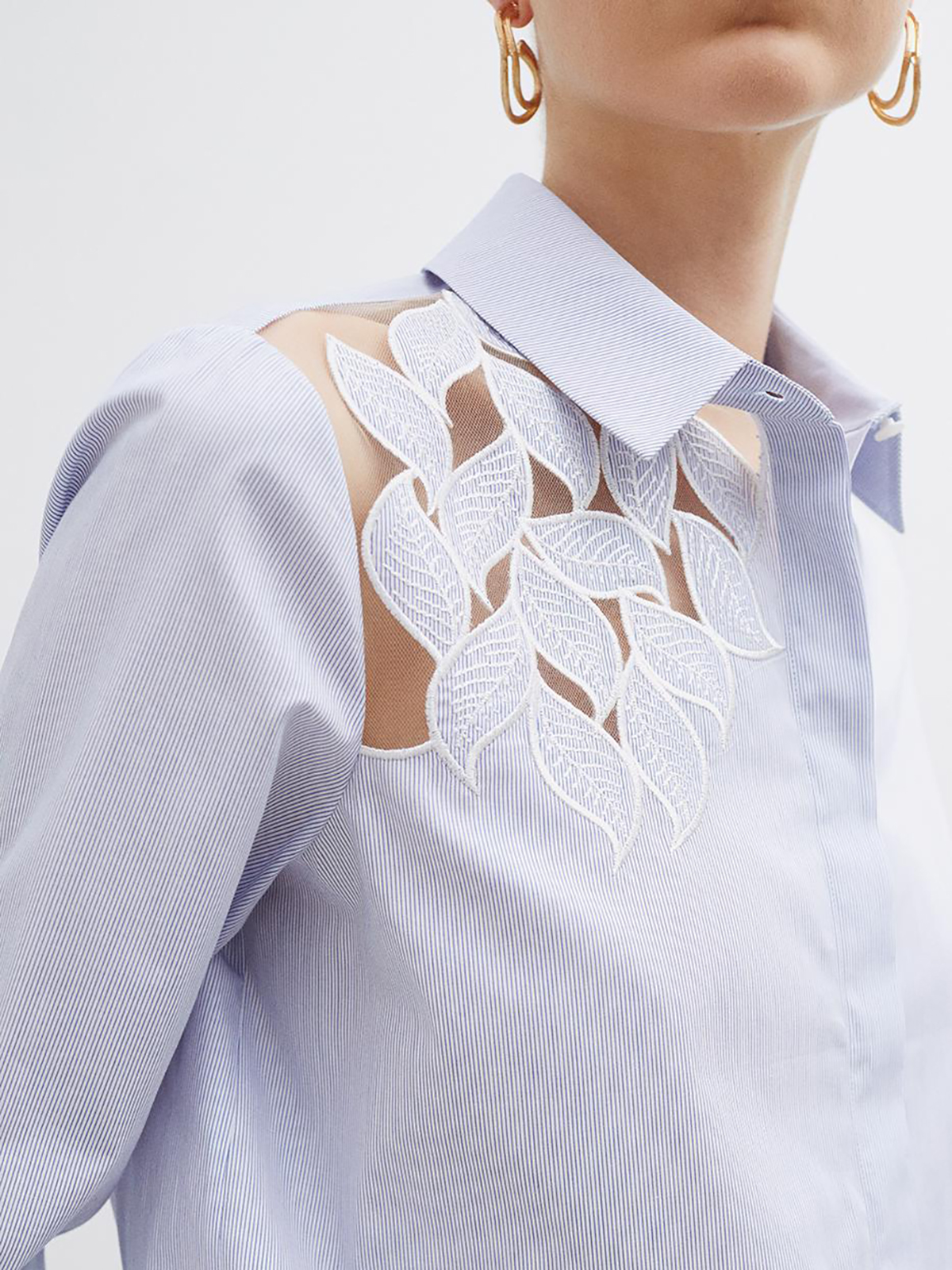 Однотонная рубашка прямого кроя с оригинальным растительным элементом на плече. Отложной рубашечный воротник, супатная застежка на пуговицы. Длинный втачной рукав с манжетами.