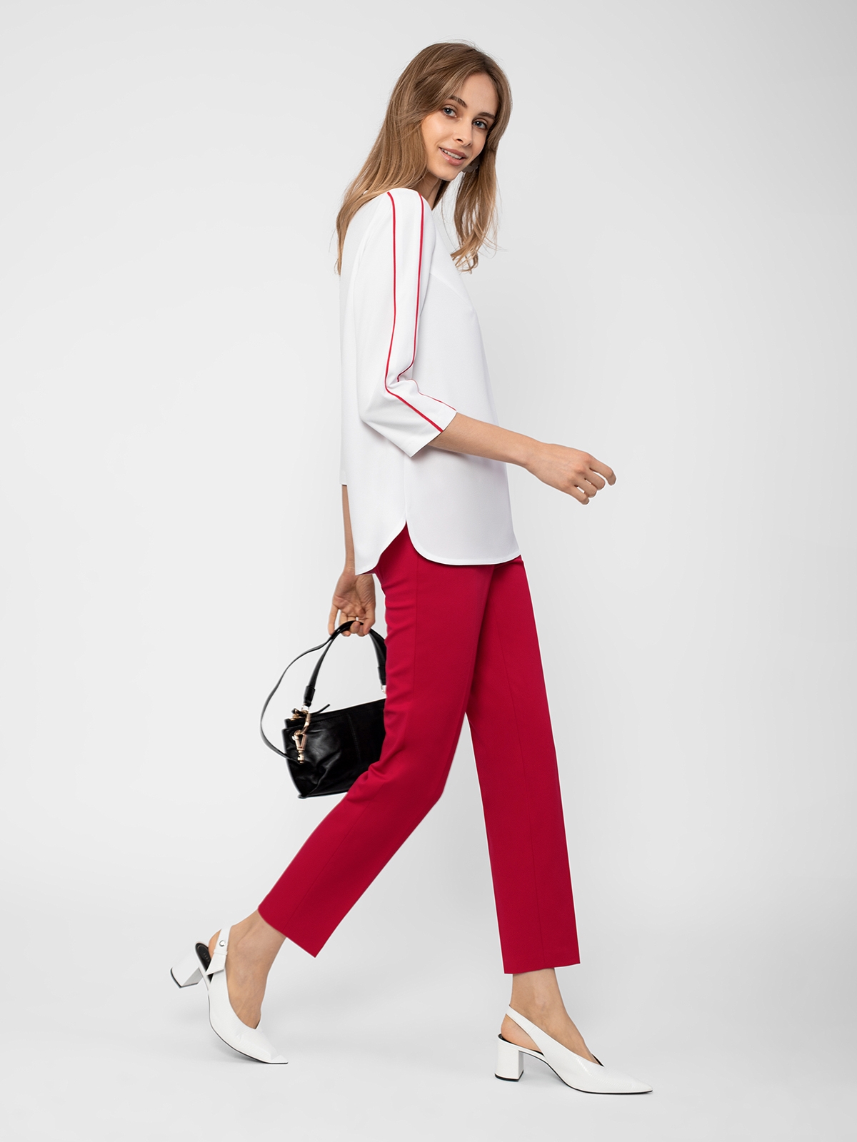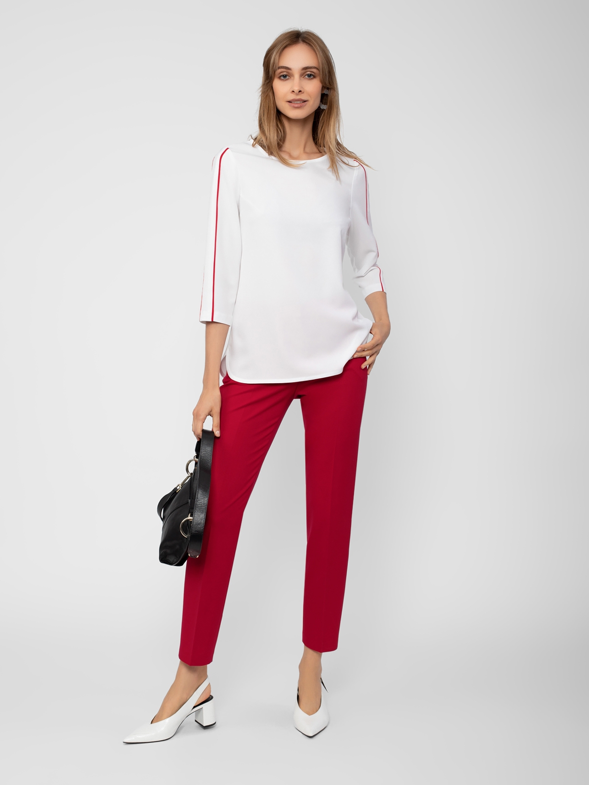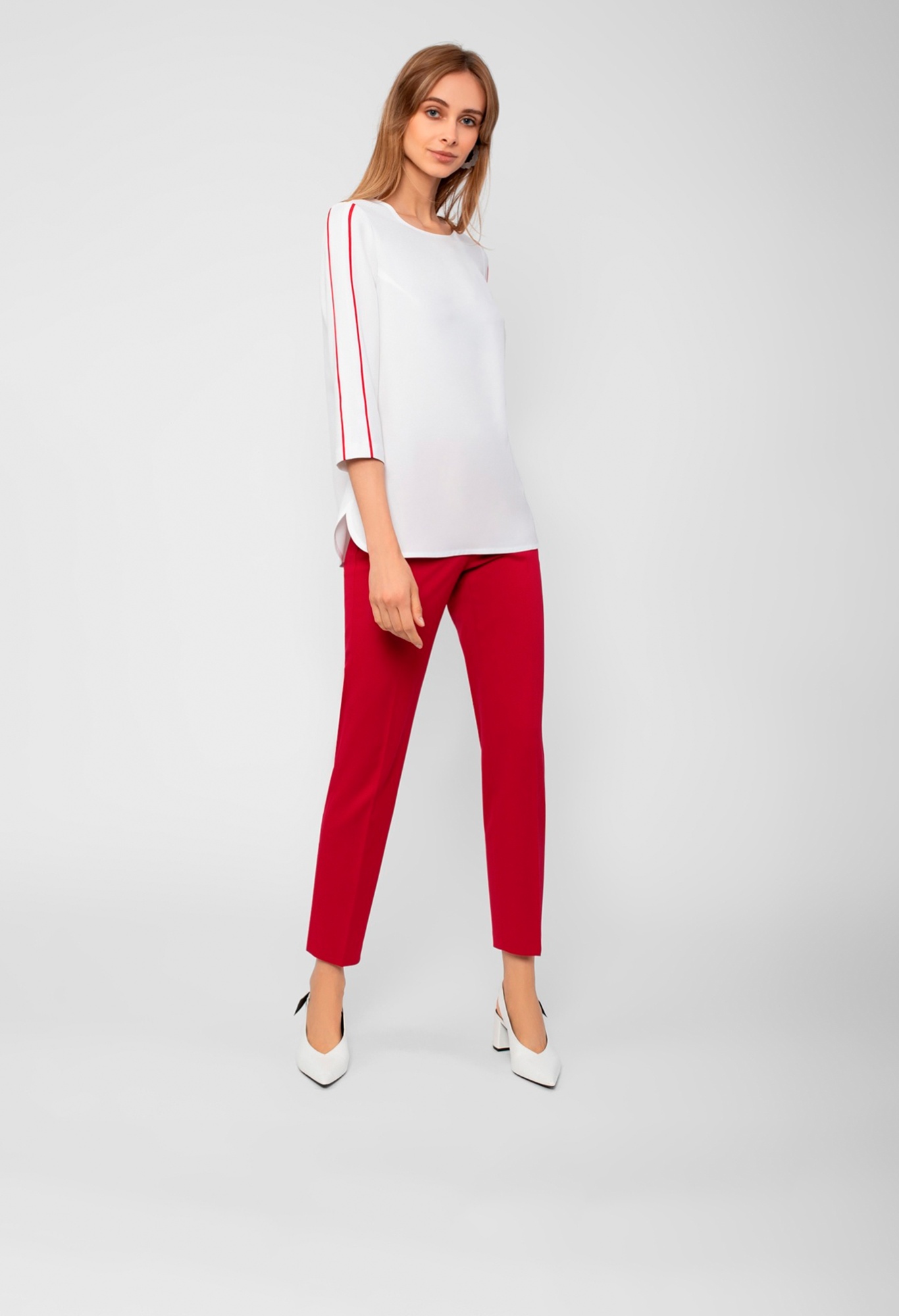 Блуза прямого силуэта с круглой горловиной и укороченным втачным рукавом. На рукавах контрастные декоративные лампасы.