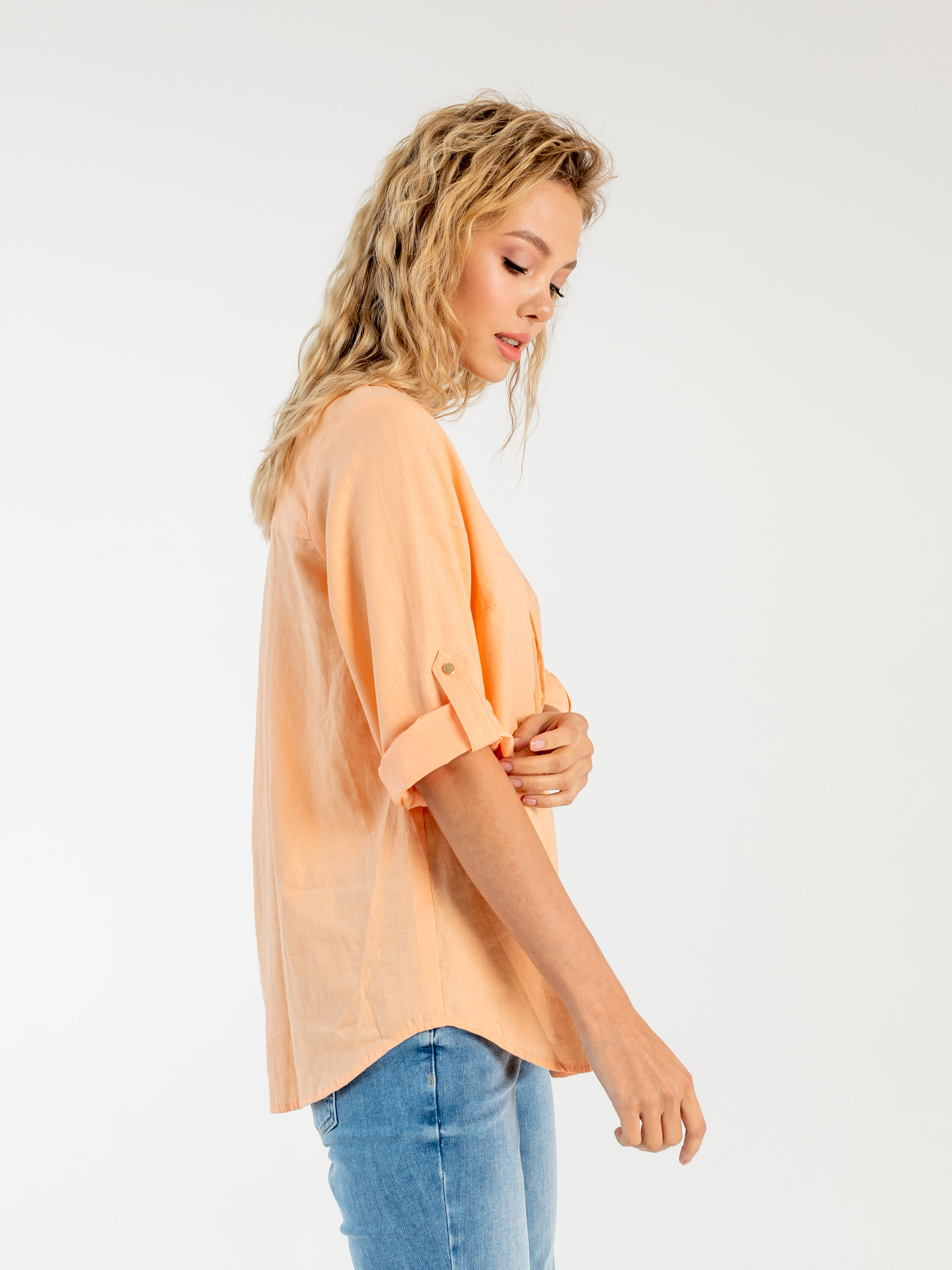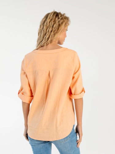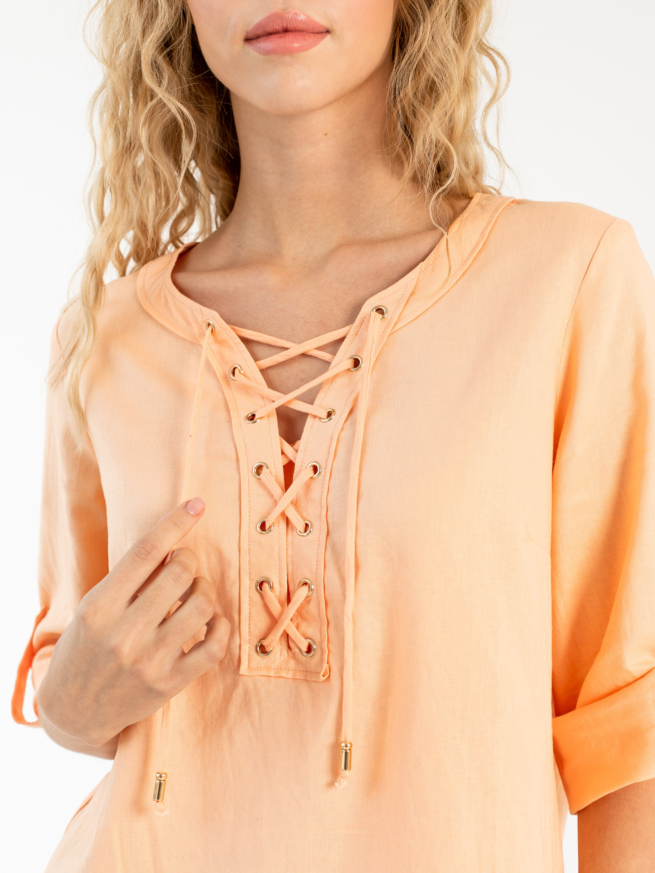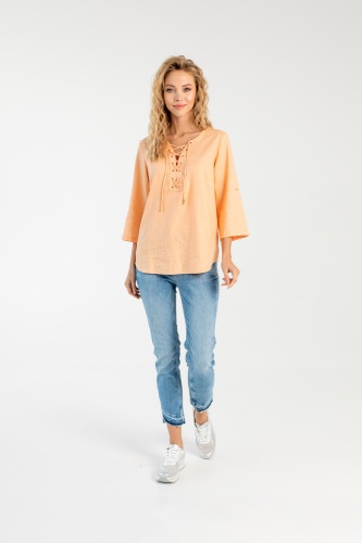 На сайте указаны российские размеры. Ткань: смесовая – лен и хлопок, максимально приятная телу. Крой: Свободный силуэт и встречная складка под кокеткой на спине дарят бесконечный комфорт и свободу движения. Функциональный пат позволяет добиться нужной длины рукава и надежно фиксирует желаемый уровень. Отделка: красивая шнуровка на груди – главное украшение блузки, придающая очарования и легкости бохо-стиля. Золотистые наконечники шнурка прекрасно подходят к цвету блузки. Скругленный низ изделия гармонирует с круглым воротом верха, создавая идеальные пропорции. Лучшим компаньоном блузке станут джинсы или брюки прямого или расклешенного силуэта из коллекции Stern.