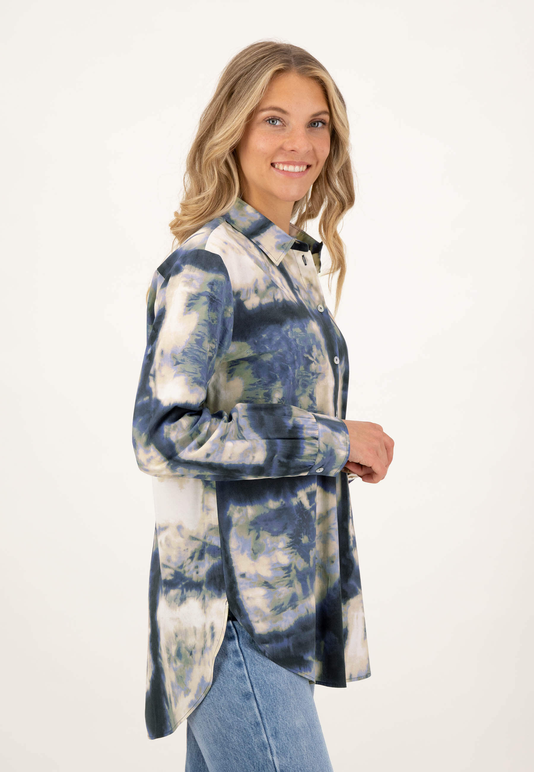 На сайте указаны российские размеры. Экологичная блуза-рубашка синего цвета с принтом тай-дай по всей поверхности. Сделано из экологически чистых материалов и "Сделано в Европе" - это только два аргумента в пользу этой блузки. Он впечатляет не только своим привлекательным принтом по всей поверхности, но и интересными деталями, такими как гофрированный низ рукава, двухъярусный закругленный низ или блестящие перламутровые пуговицы. Наша модель ростом 177 см. Измерения для 44 размера: Окружность груди: 112 см Талия: 110 см Бедра: 119 см Длина спинки: 78 см. Длина рукава: 60 см.