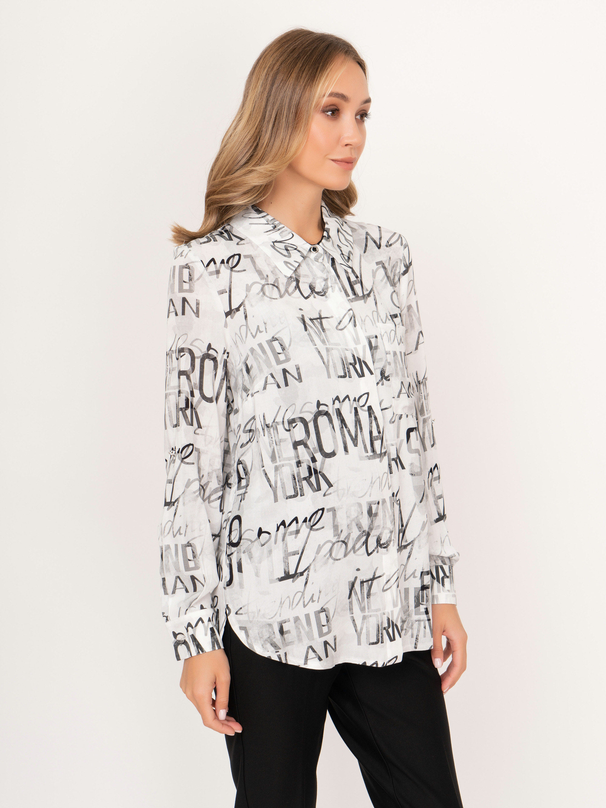 На сайте указаны российские размеры. Прямая серая блузка из вискозы на пуговицах, с отложным воротником, с длинным рукавом на манжете, с надписями. Рост модели: 175 см. Длина по спинке: 70 см.