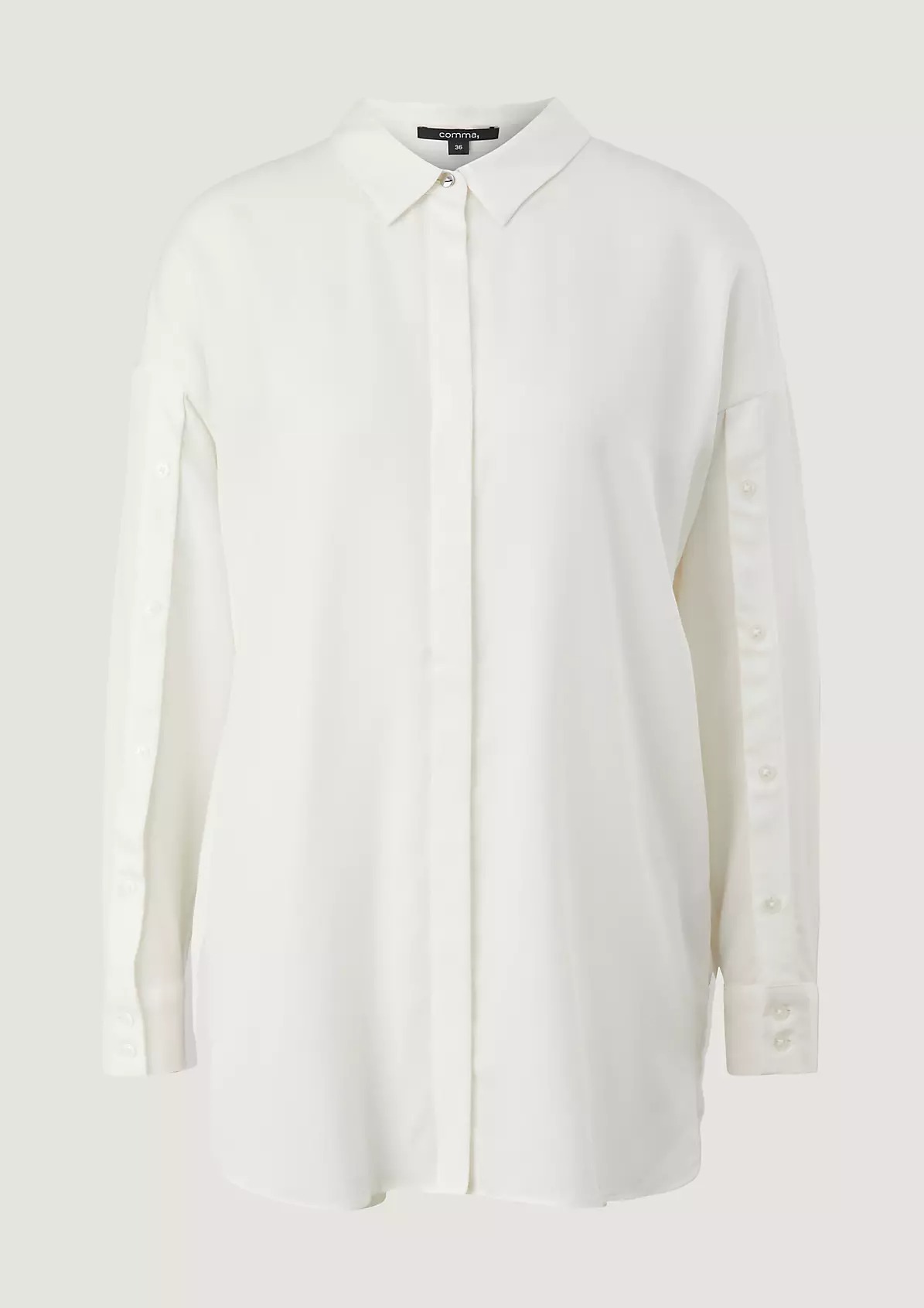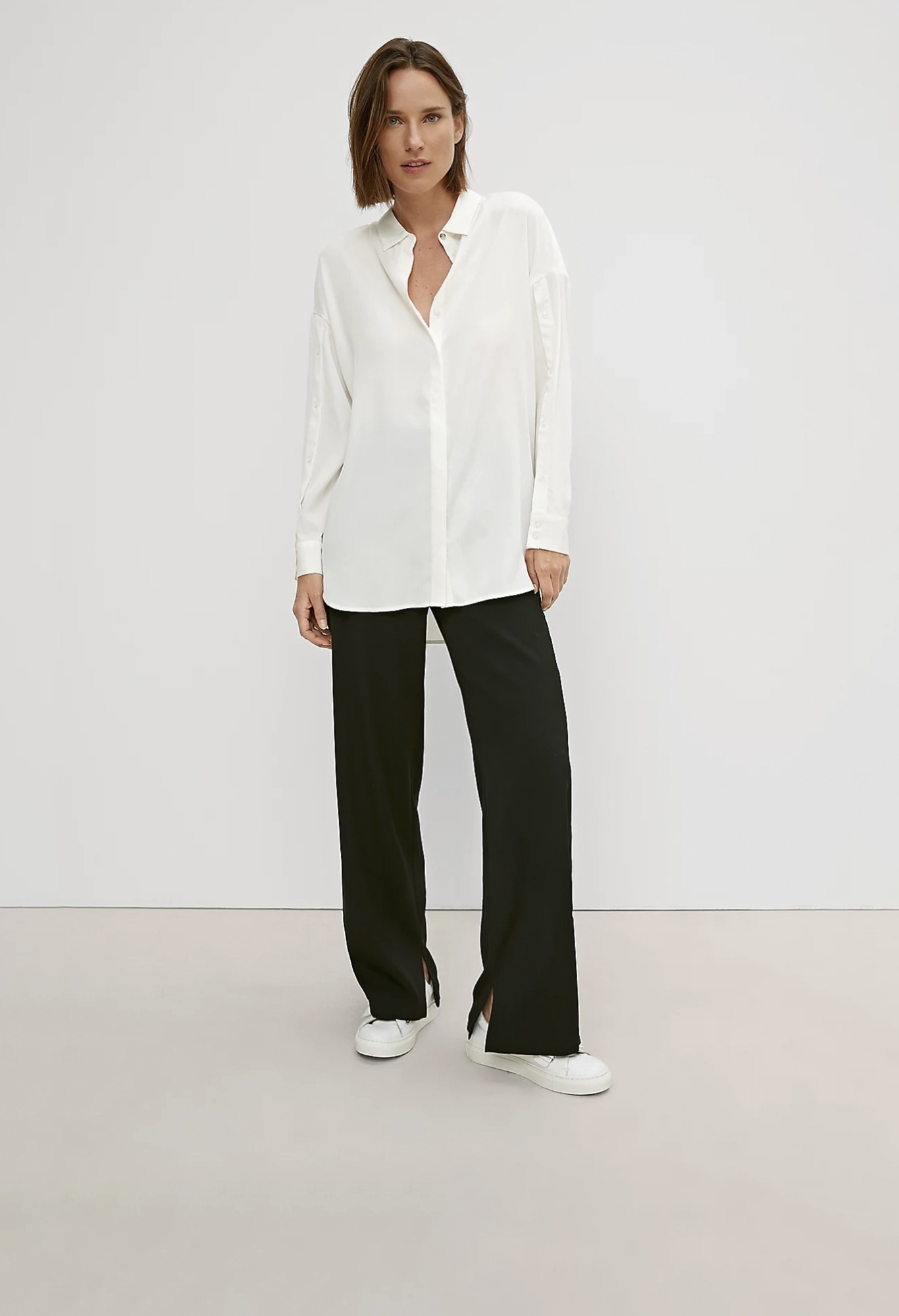 На сайте указаны российские размеры. Легкая классическая блуза с закругленным низом и разрезами сбоку. Застежка: планка с потайными пуговицами. Рукав: манжеты.