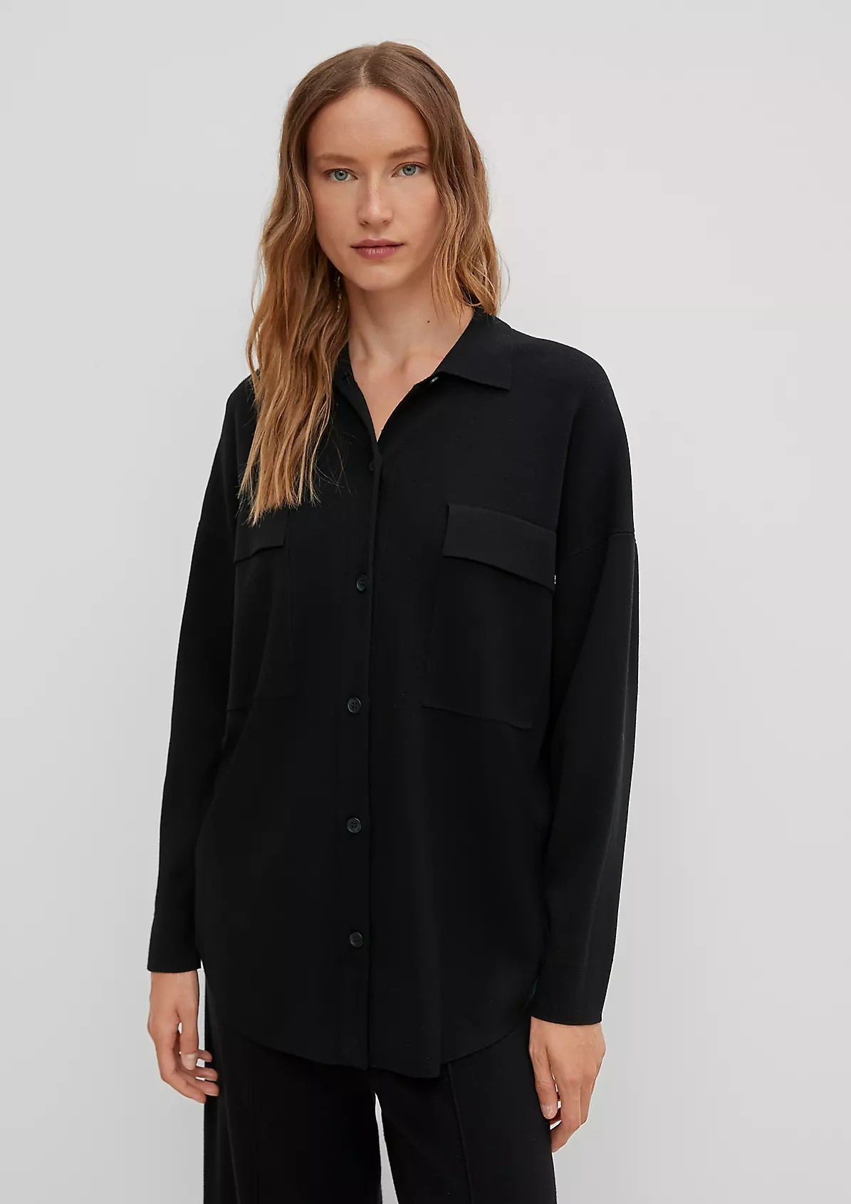 На сайте указаны российские размеры. Однотонная блуза с отложным воротником и планкой с пуговицами. Впереди нагрудный карман. Закругленный подол. Длина по спинке для размера 42 около 77 см.