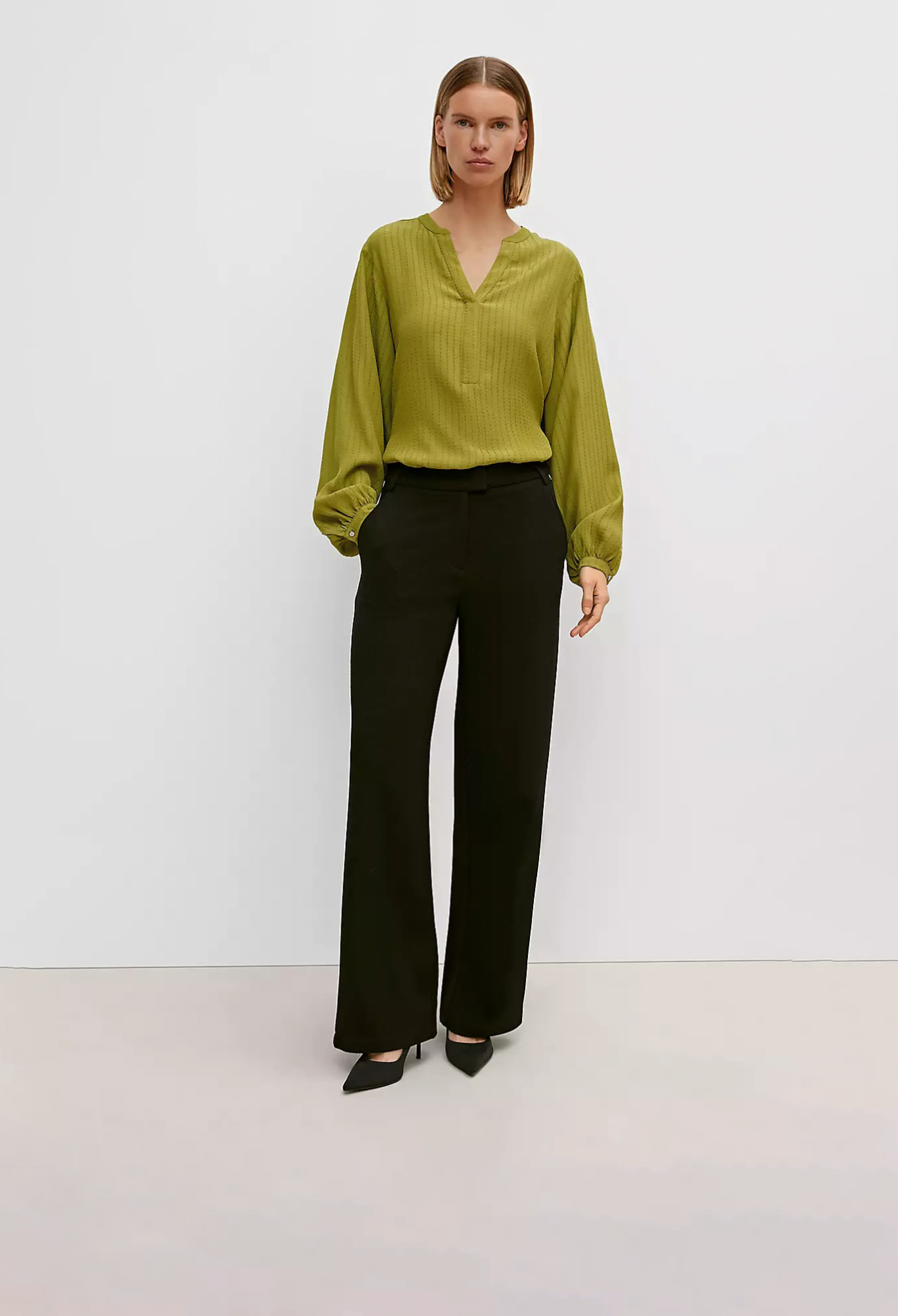 На сайте указаны российские размеры. Блузка из вискозы с узорчатой фактурой. Широкие рукава, длинные рукава, манжеты. Длина спины: 63 см в размере 42. Рост модели 177 см.