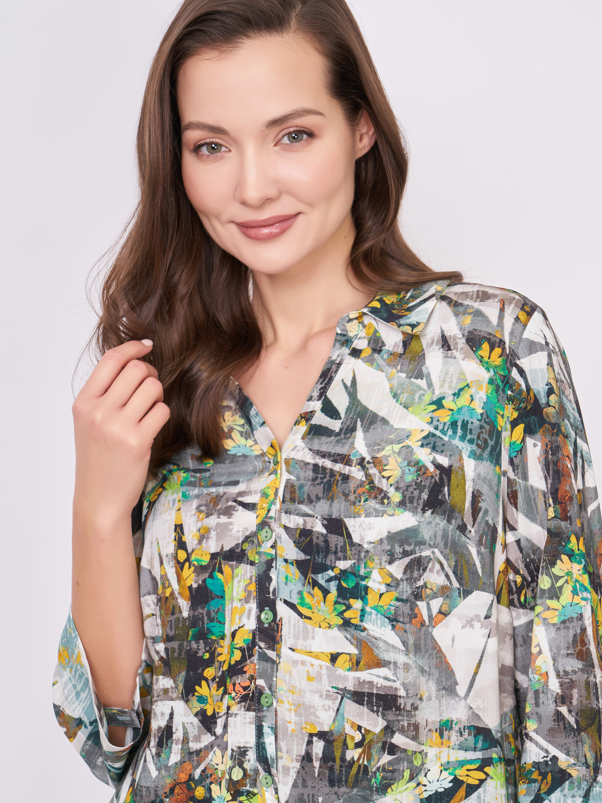 На сайте указаны российские размеры. Текстильная прямая зелено-серая блузка на пуговицах, с отложным воротником, с укороченным рукавом 3/4, с цветочным рисунком. Длина по спинке: 77 см. Рост модели: 177 см.