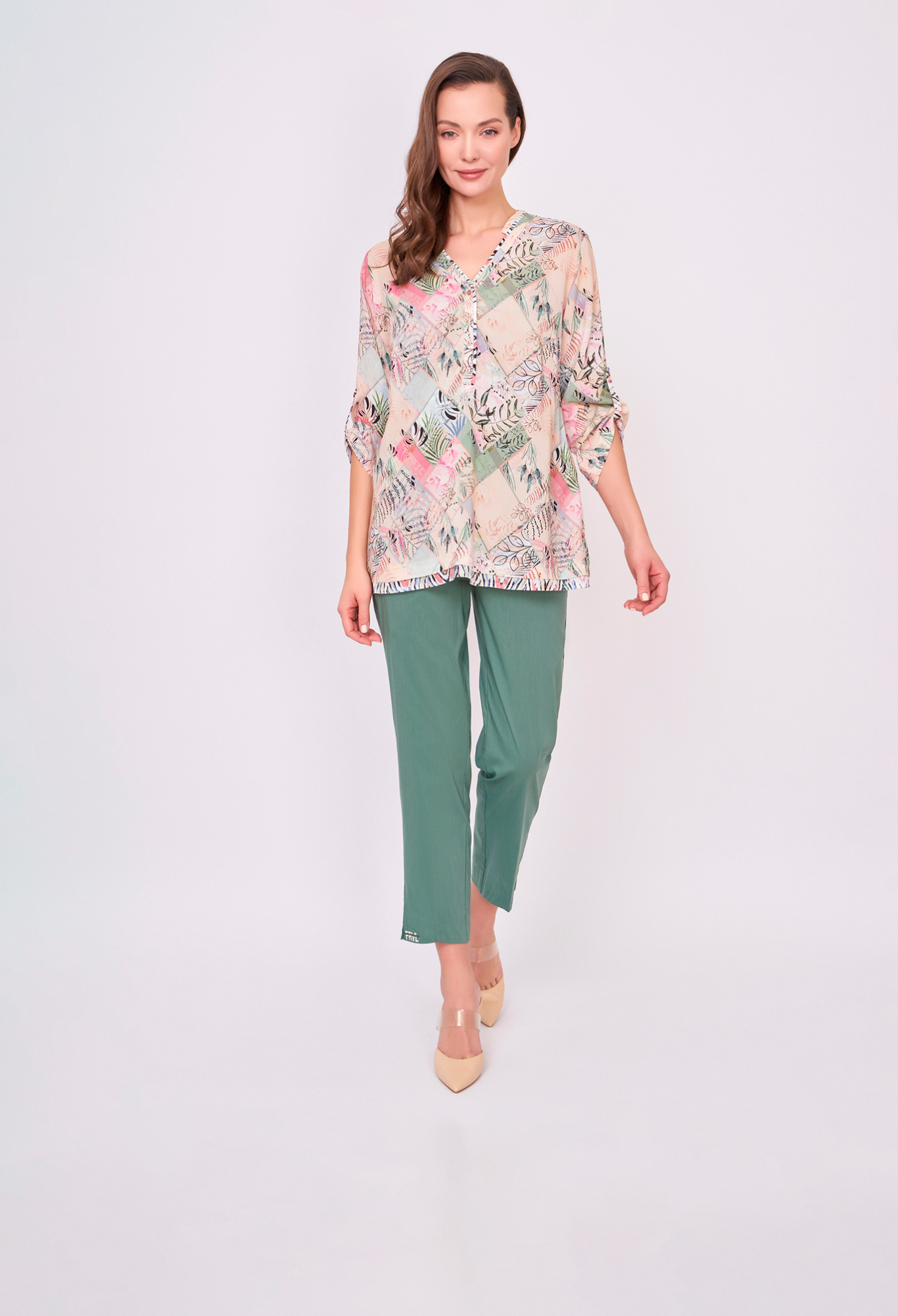На сайте указаны российские размеры. Прямая текстильная персиково-розово-зеленая блузка на пуговицах, с V-образным вырезом, с укороченным рукавом 3/4, с цветочным рисунком. Длина по спинке: 66 см. Рост модели: 177 см.